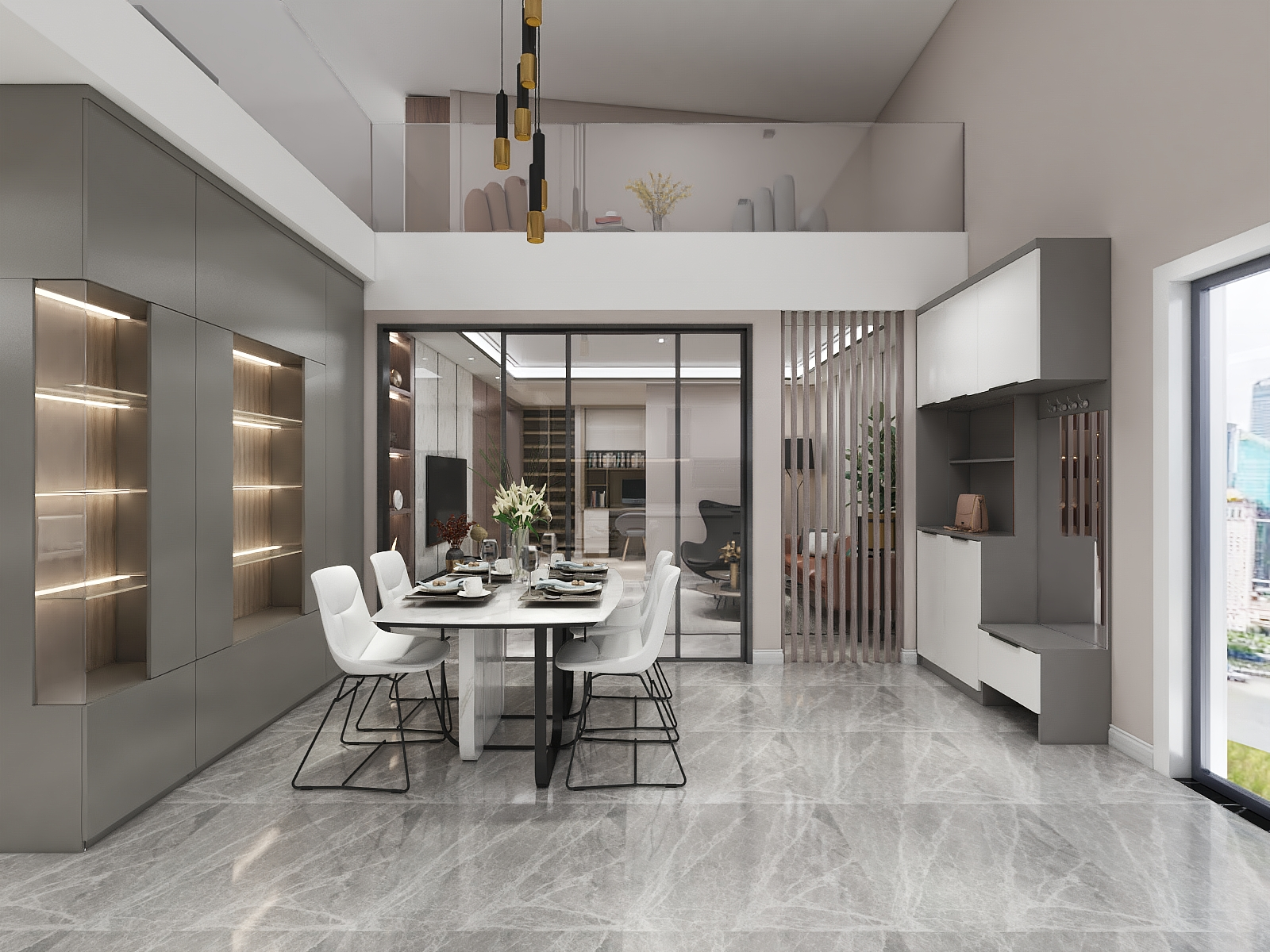 餐邊柜設計時,根據生活需求采用封閉與開放結合的設計,不僅可以實現多樣化的存儲功能,同時還能夠起到展示作用,優化餐廳氛圍。