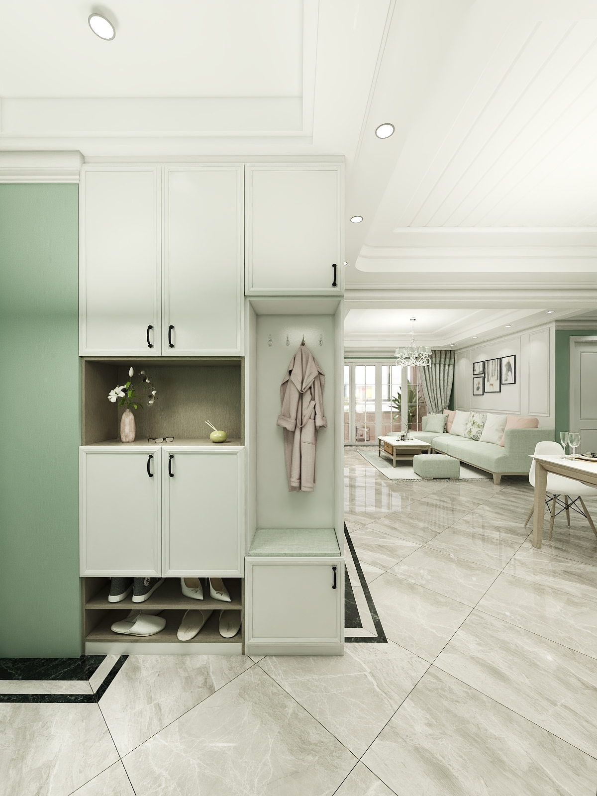 入戶設計以簡潔明快的風格為主,功能性與美觀性并重,既要滿足家里的一部分收納需求,又要通過巧妙的設計,使之看起來更加干凈清爽。