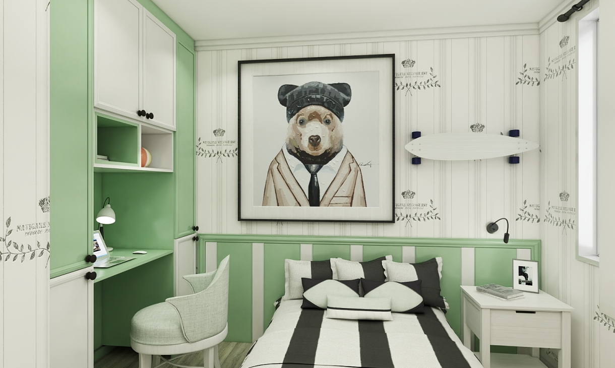 (3)根據孩子性格設計。定制兒童房與普通兒童房在設計時,最大的差別就是針對性,普通兒童房大同小異,任何孩子都能住進去,而定制兒童房是專門根據孩子的個性特點設計的,如果家中的小孩性格比較活潑,那么兒童房中的布置能以跳躍為主,如果家中孩子比較安靜,兒童房布置以溫馨為主,不同的風格特點,對于營造孩子的性格有極大幫助。
