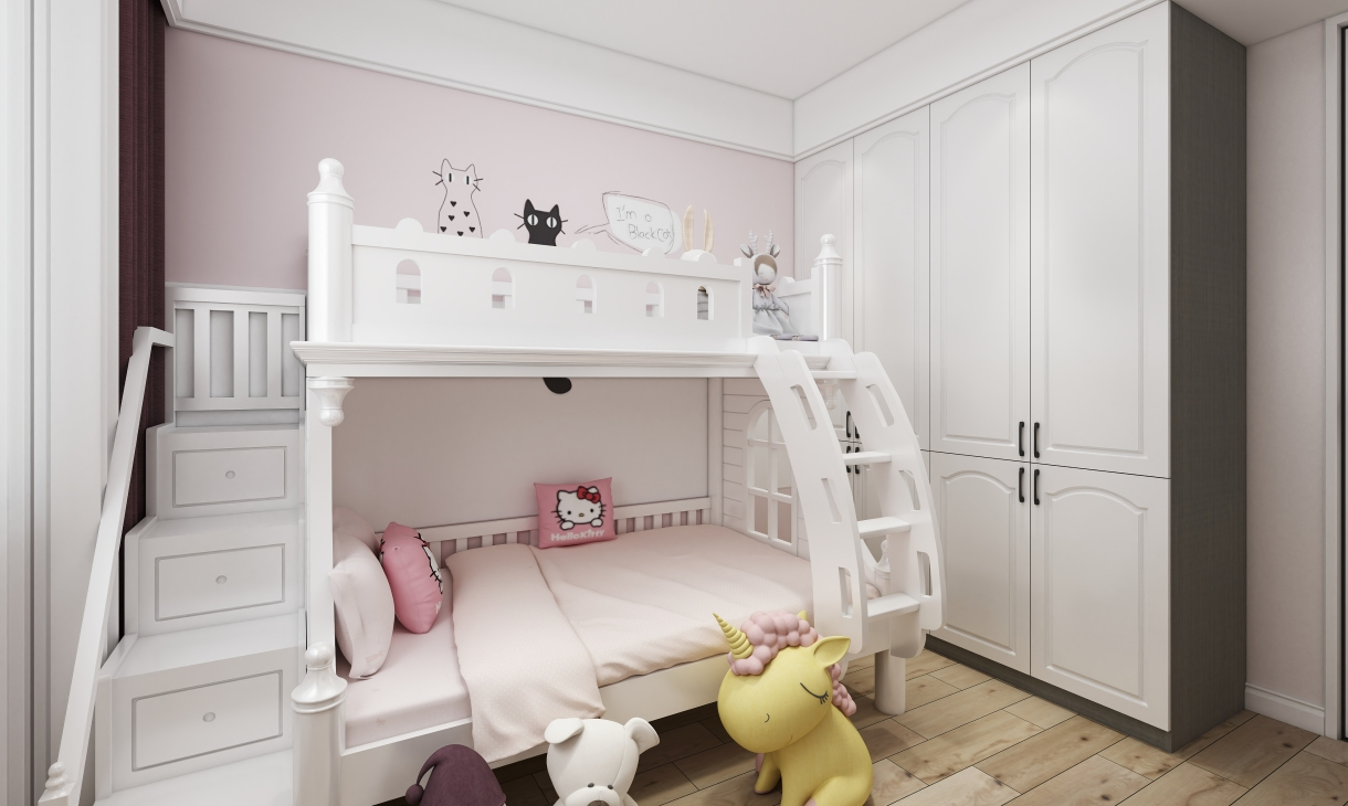 (3)實用性。隨著三胎政策的推行,越來越多的家庭準備生二胎或者三胎了,但是部分父母考慮到家中面積有限,孩子生出來不知道睡在哪?其實,這個問題使用一張上下床就能輕松解決,在進行兒童房定制時,家具多設計為可收縮模式的,需要時打開,不需要時也不會占據多余空間。