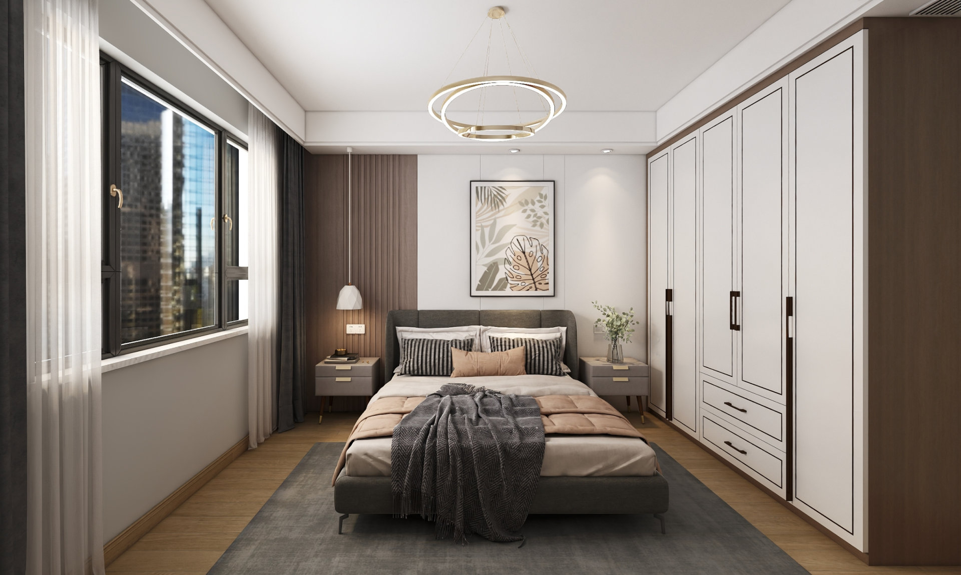 主臥色調素雅溫馨,淡淡的卡其色舒適淡雅,床頭墻面背景使用拼接設計的護墻板,更具美感,柜體顏色和護墻板相呼應,,美觀和諧。