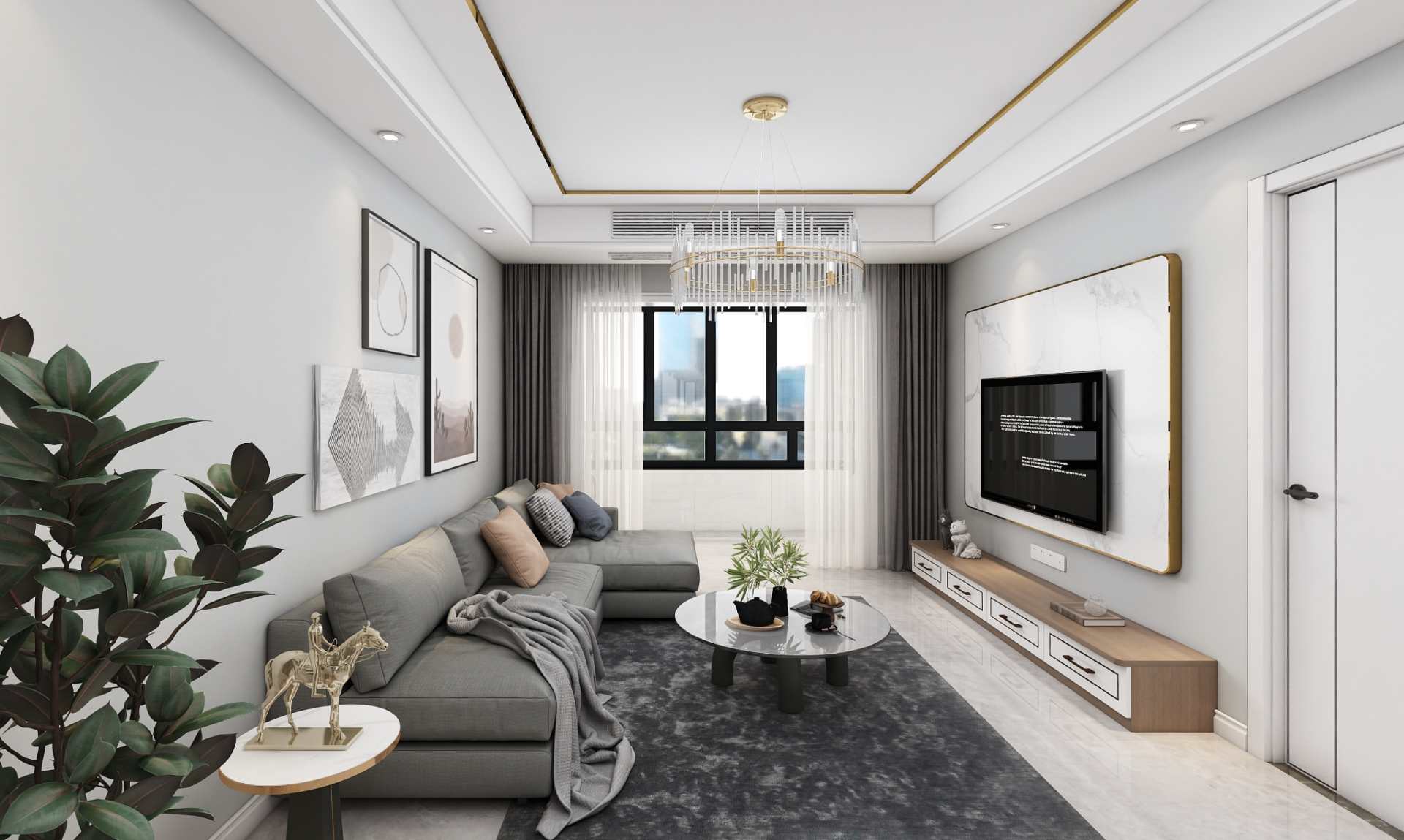客廳整體使用淺灰色,護大理石電視墻+布藝軟裝+柔和的光線,打造溫馨舒適的客廳環境,落地大窗增加了空間的通透性,高級有格調。
