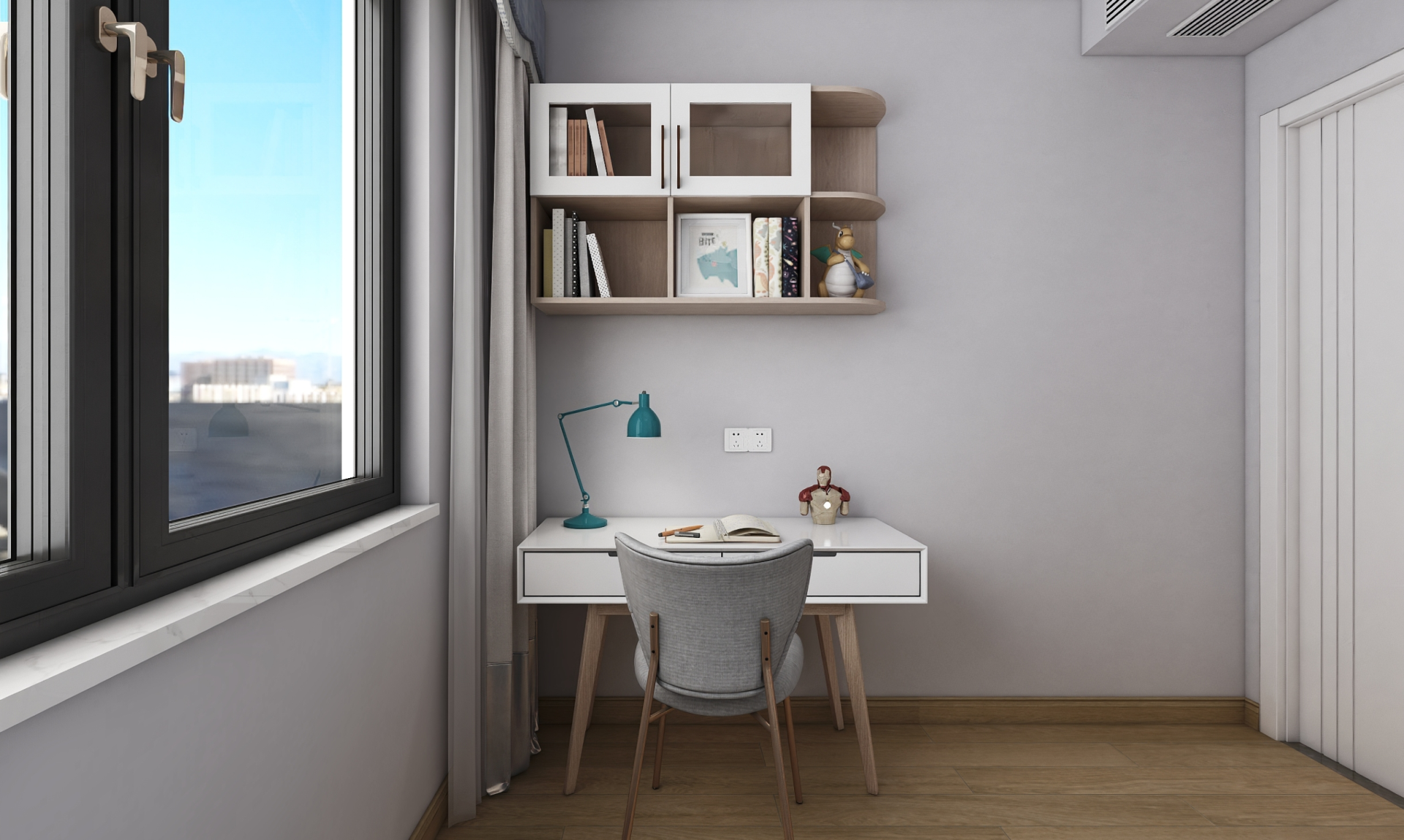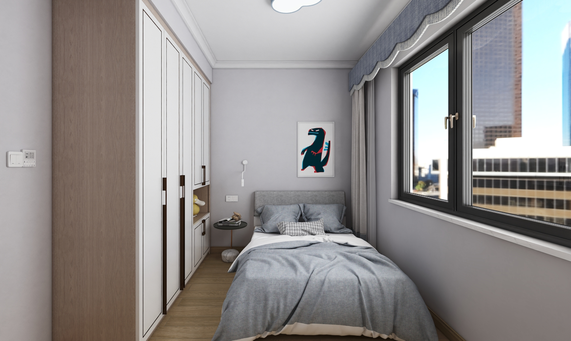 男孩房衣柜字啊下半部分做一個開放格設計,方便防止一些小孩玩具或者書籍,照顧到小孩身高方便拿去,床尾放置小書桌和吊柜,作為讀書和諧作業區域。