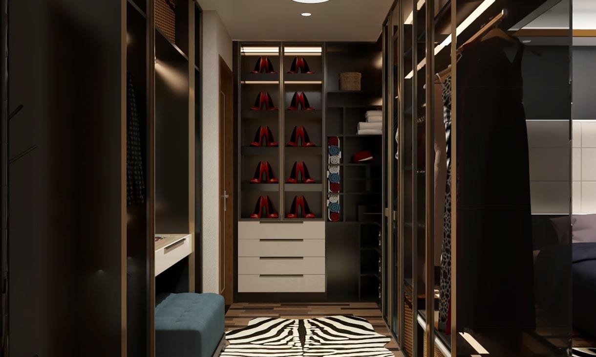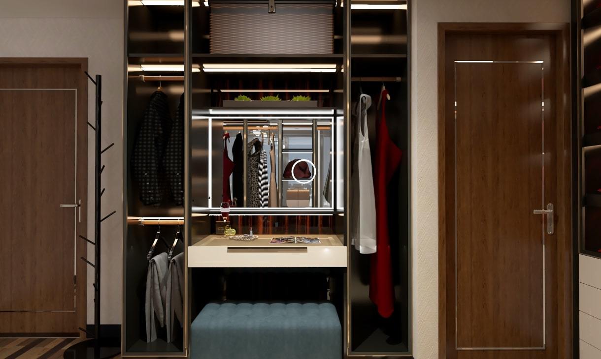 黑色柜體,玻璃拉門搭配十分時尚,視覺效果很有沖擊力,從設計上感受到輕奢的魅力,格調體現在整個空間里。每個女性,無關年齡對于衣帽間都有向往,將自己精挑細選的寶物一一陳列在獨屬于自己的空間里,是一件很有成就感的事情。