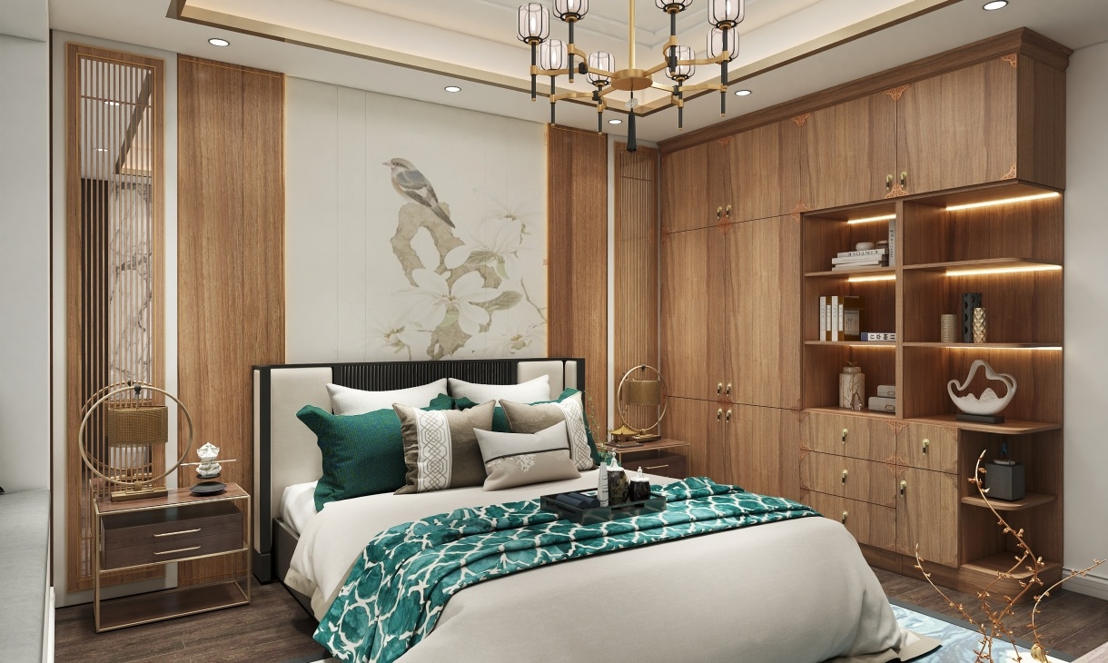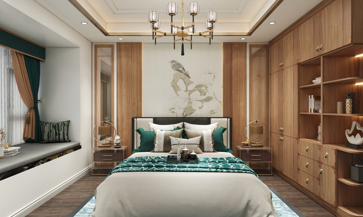 以新中式元素為設計基礎,衣柜是拉手和邊緣的細節都充滿著新中式的精致,墻壁掛畫以山水墨色為主題,古色古香。飄窗的設計,又給整個空間加光添彩,就連吊燈都細節滿滿,新中式風格彰顯的淋漓盡致。