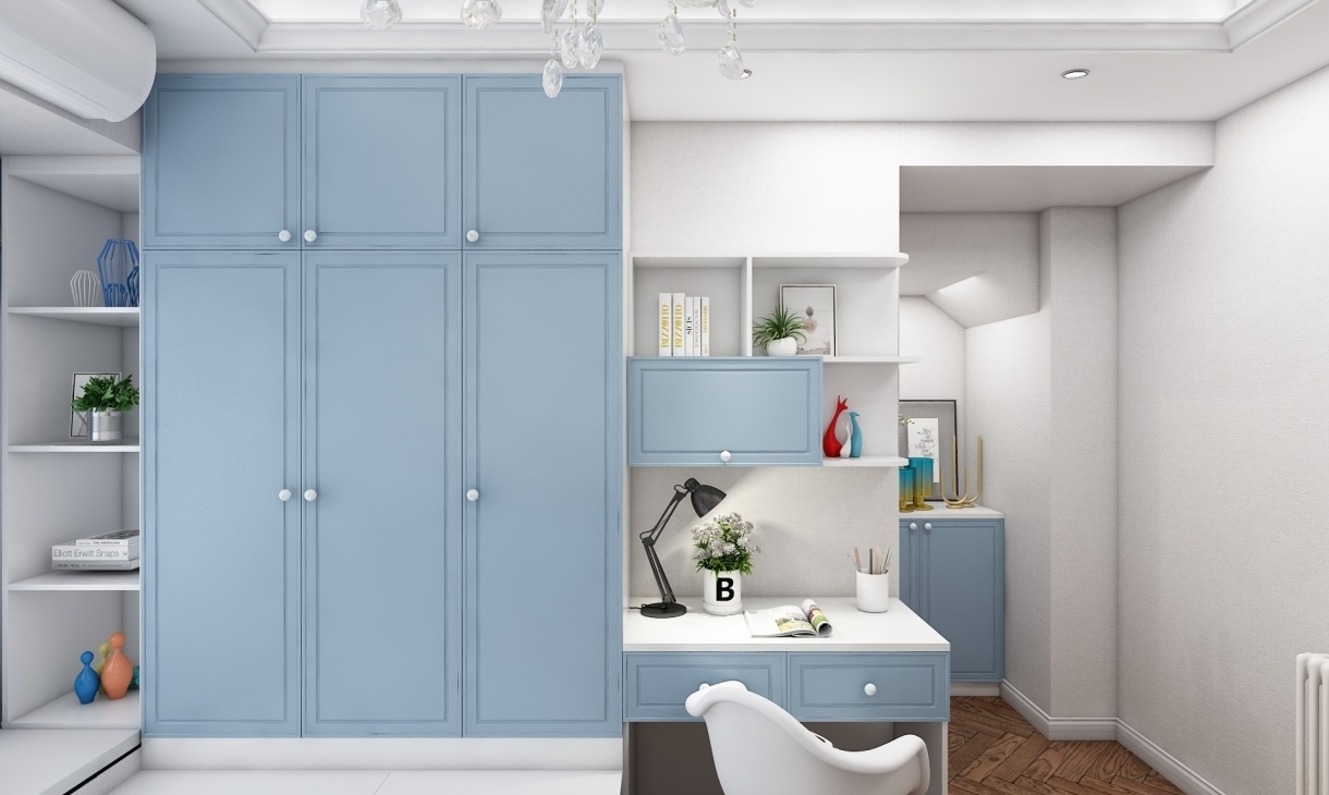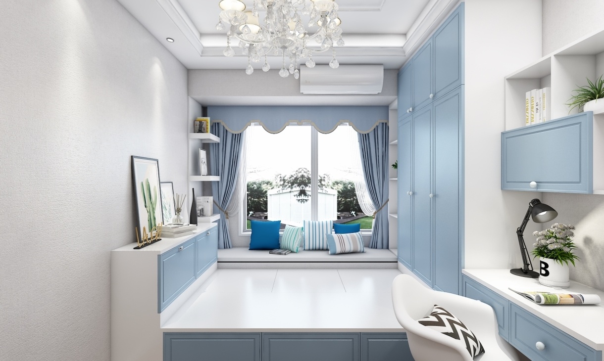 藍色給人一種給人溫柔、安靜的顏色,整個空間以淺藍色和白色為主,淺藍色的衣柜,藍灰色的窗簾,拉伸了空間,使得空間感十足,榻榻米可以休息,學習,玩樂空間。