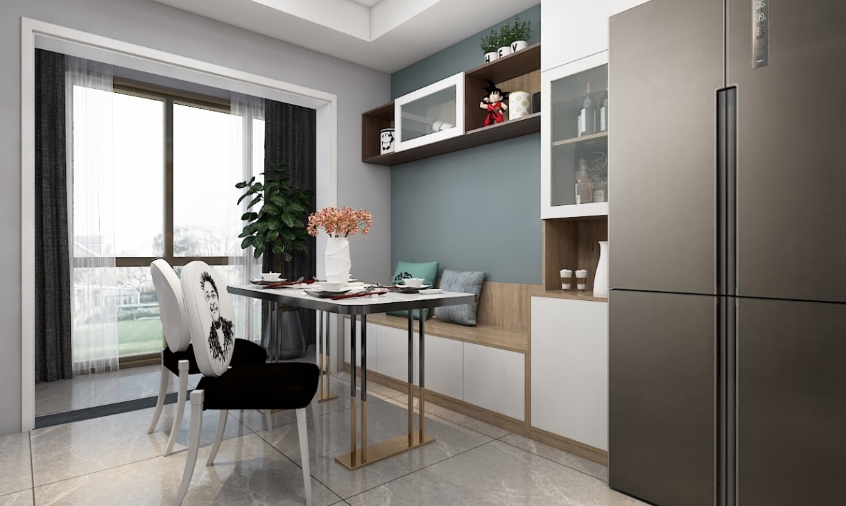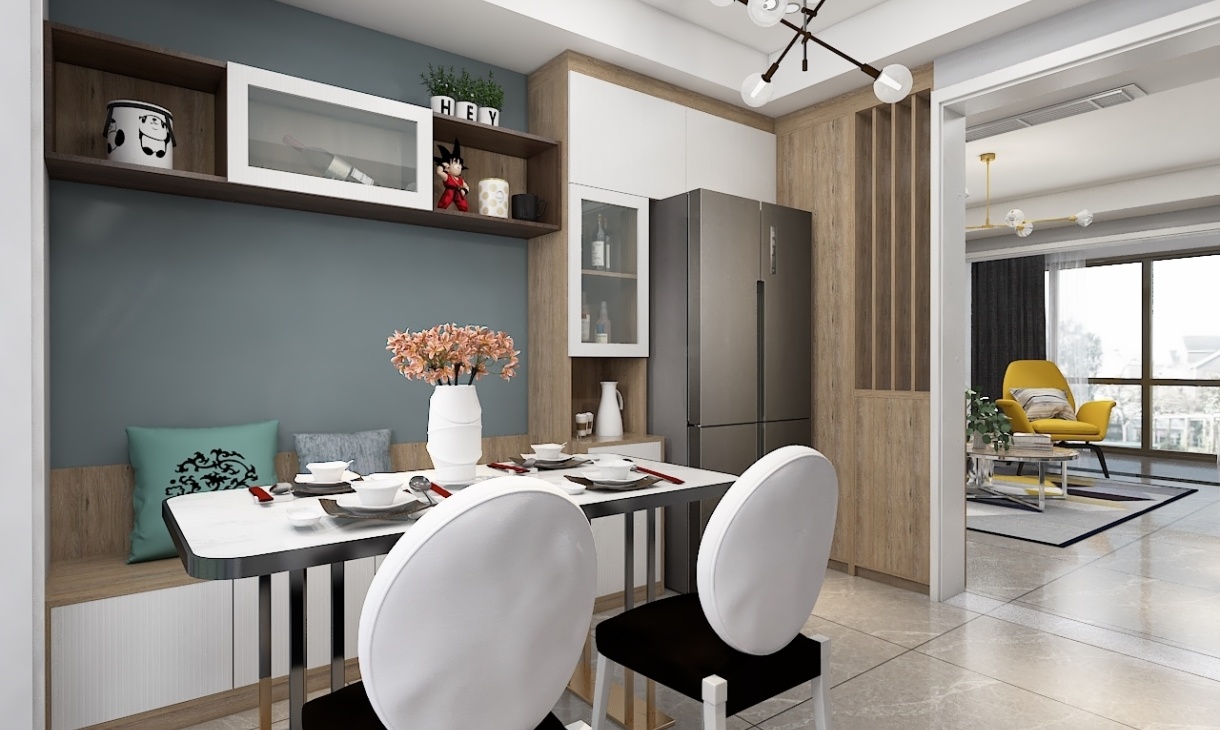 餐廳不只是吃飯的地方,這里也很能體現(xiàn)業(yè)主的素養(yǎng),餐桌對(duì)面設(shè)計(jì)了休閑空間,還有懸掛裝飾空間你,既能滿足收納,又可以起到裝飾作用,冰箱鑲嵌在后面的裝飾柜里,方便又美觀。