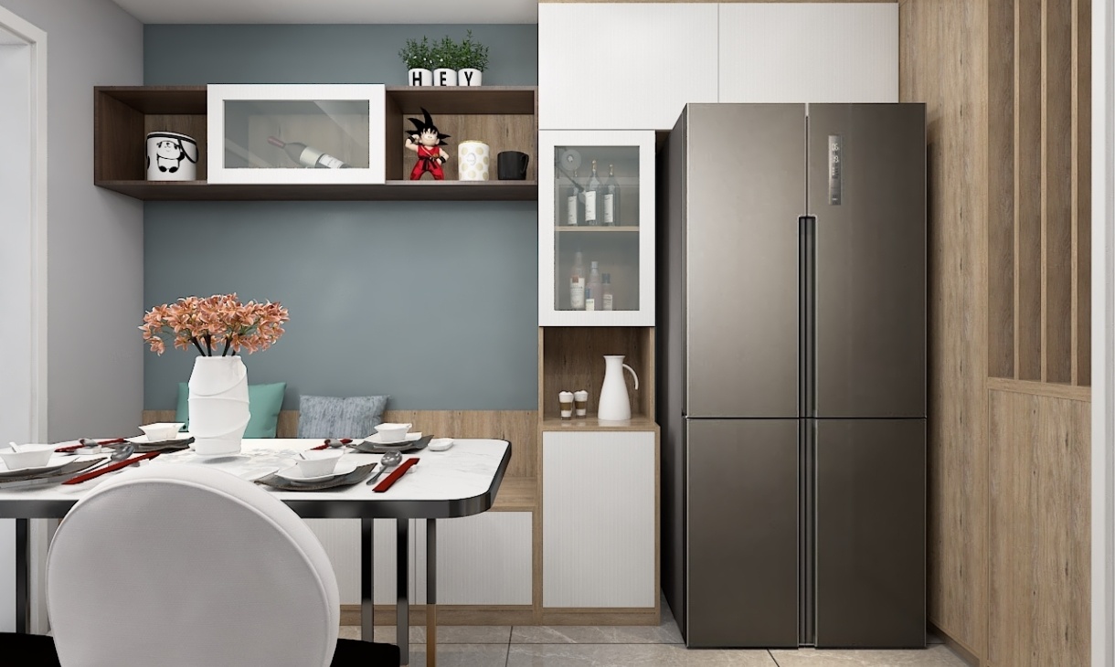 在最小的空間里,設(shè)計(jì)出了功能性最強(qiáng)大的餐廳,鑲嵌在裝飾柜里的冰箱充滿新意,綠植和花束的加入,顯現(xiàn)出業(yè)主對(duì)生活的態(tài)度,積極和情趣。