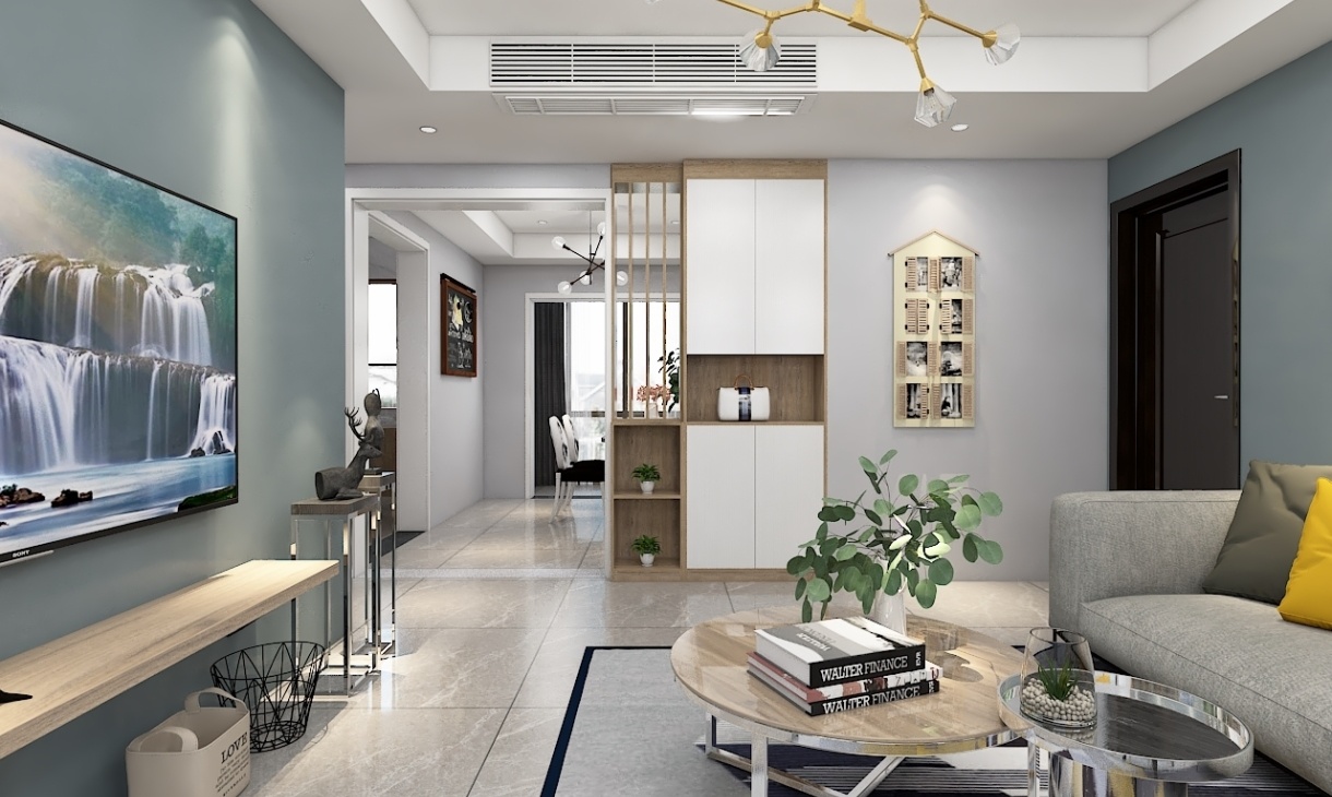 淺灰色的瓷磚和一部分灰色墻面兩者相呼應(yīng)著,與米白色的裝飾柜形成鮮明的對(duì)比,藍(lán)灰色的墻面和灰色的麻布沙發(fā)相呼應(yīng)著,原木色的茶幾使得空間多了一絲隨意,時(shí)尚的吊燈提升了空間的視覺感。