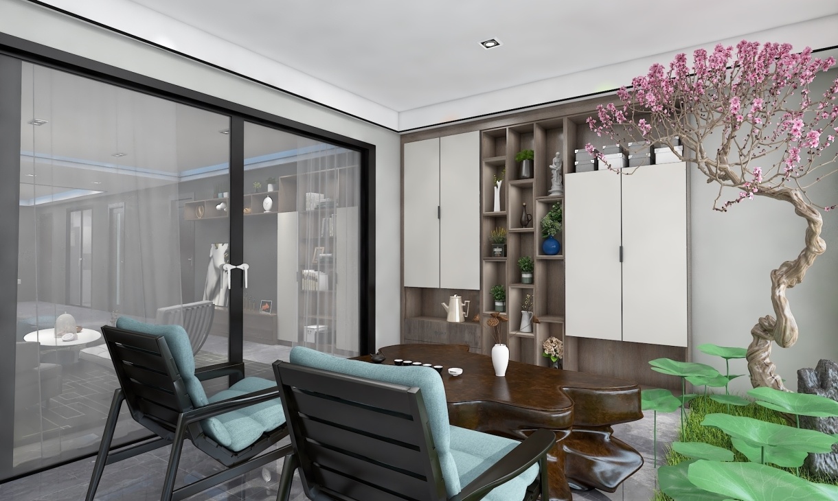 如同渾然天成的深棕色茶桌,在亞麻藍坐墊的襯托下,更顯得古色古香,精致的裝飾柜讓這個深色空間里多了一絲柔和,擺放的展品也很用心,綠植盆景和窗戶邊上的桃花假石形成巧妙的精致,設(shè)計者以簡單是線條將陽臺與其他空間分割開來,透明的玻璃窗讓整個陽臺空間也成為景色之一。