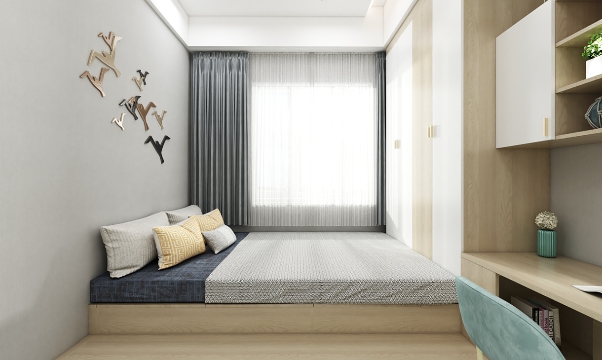 白色與原木色的拼接衣柜,與原木色和木地板相互呼應,原木材質的家具感覺上帶有溫度,藍綠色的椅子和書架上的綠植在空間里起著點綴作用,讓素凈的空間多了色彩。灰色和仿光窗簾添加了白紗,在視覺上減輕了灰色帶來的壓抑感,私人空間需要安靜,不是壓抑,生活就需要打破一層不變的枯燥,在生活可以享受家帶來的獨特溫暖。