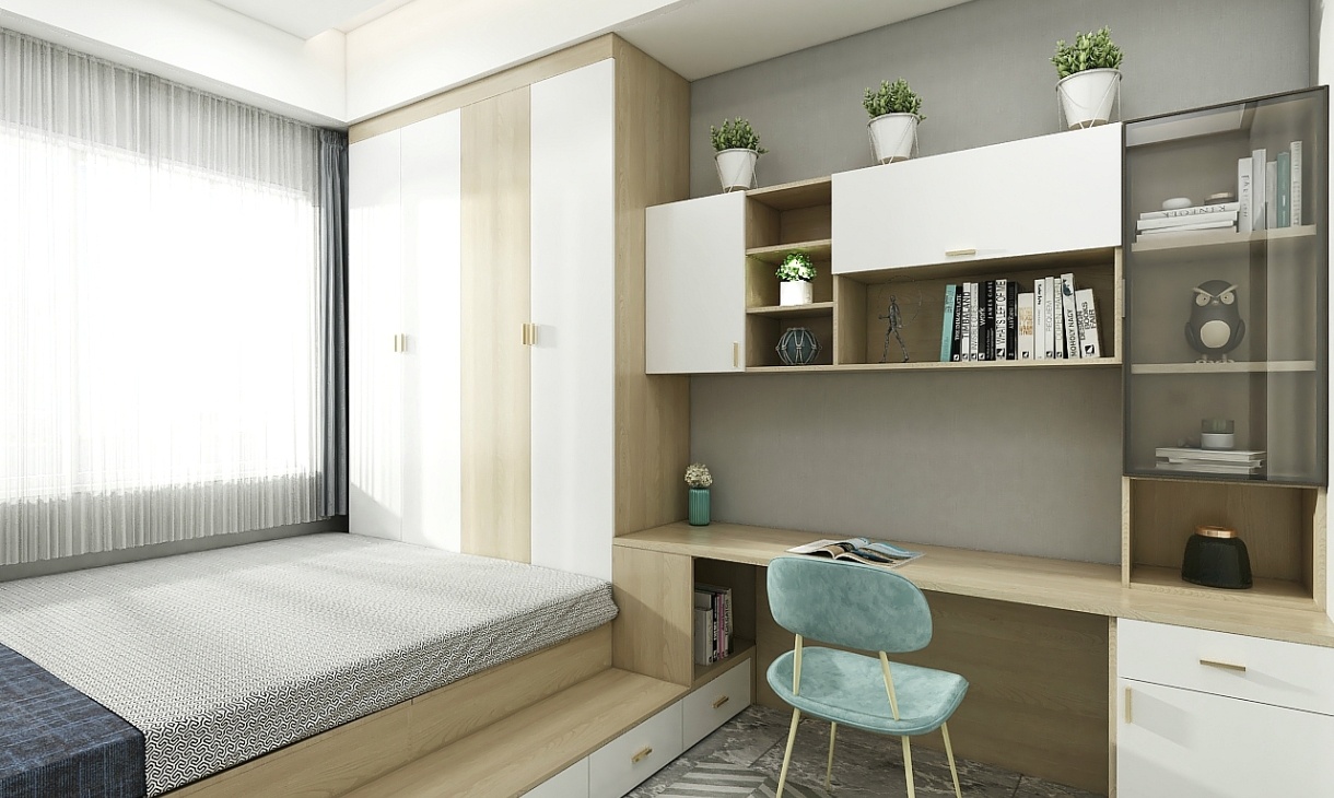 榻榻米房是集收納,休閑,閱讀為一體的空間,白色和原木色經典搭配的書桌組合,作為收納功能的到頂衣柜,完美實現大物件的收納,書桌組合設有展示區域和封閉收納作用,在展示區域放置幾本書籍或者孩子喜歡的玩具,都十分有意義,生活不是一層不變的,展示區域放置了幾盆綠植,給簡單的空間帶來生機與活力。