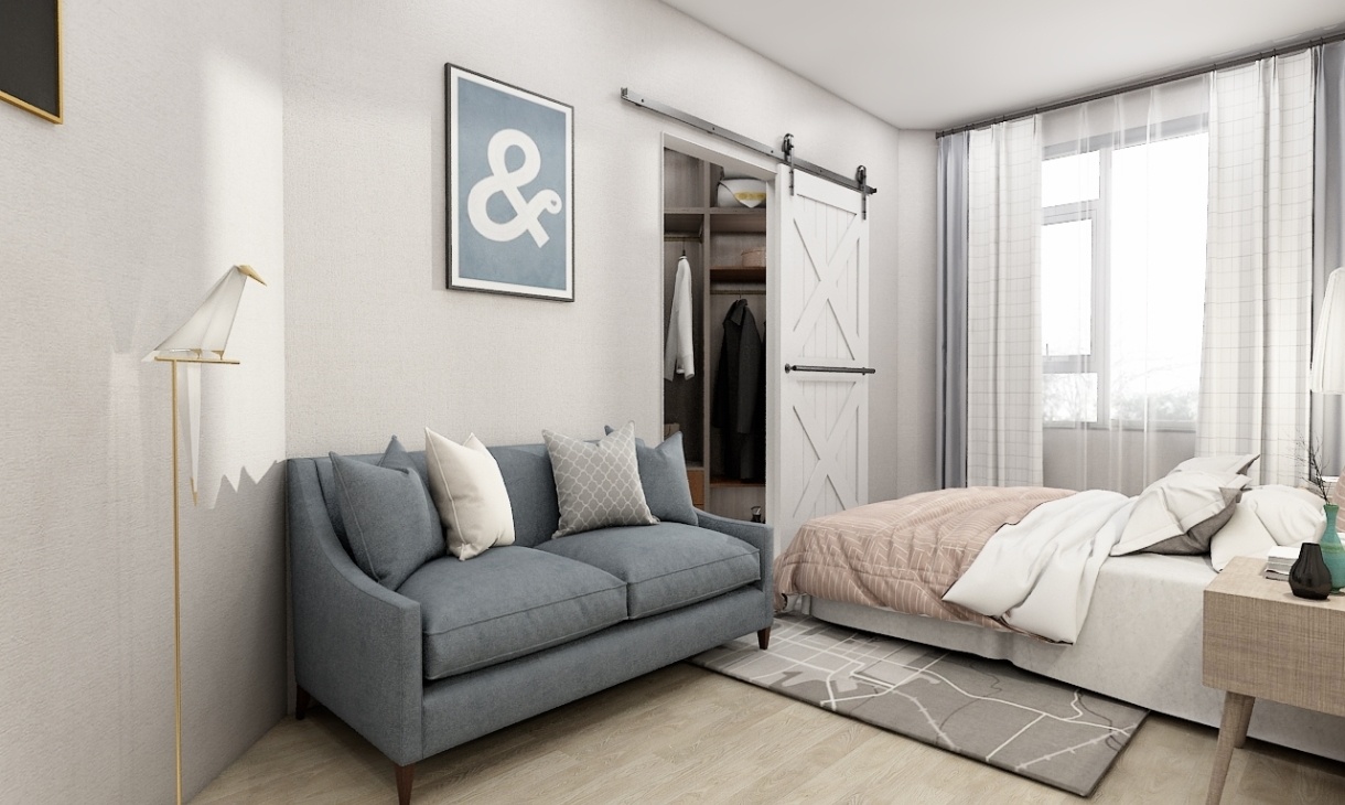 藍(lán)灰色的布藝沙發(fā)舒適感加倍,可躺可坐實(shí)用性非常高。整體顏色素凈,裝飾簡(jiǎn)單卻不失格調(diào),中性化的設(shè)計(jì),無(wú)論是男孩還是女孩主都很適合。