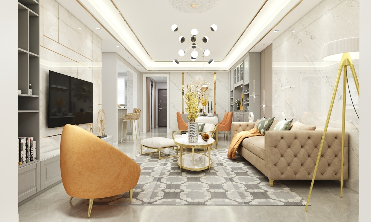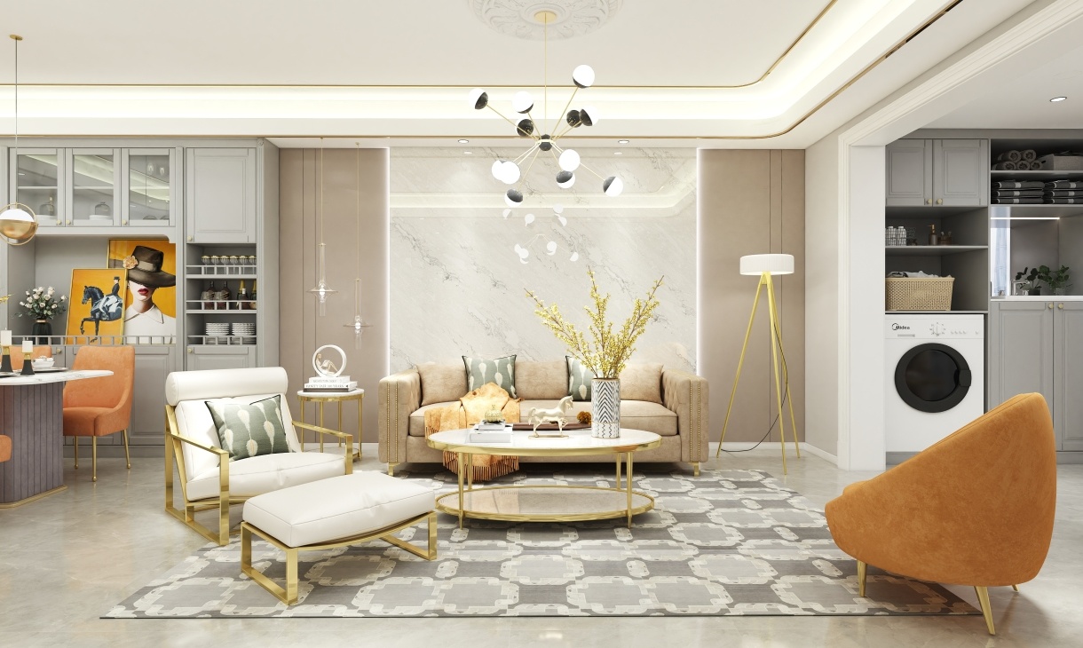 輕奢不需要過多的裝飾手法,高質感的定制沙發和簡潔的圓茶幾,就輕松的營造出了格調客廳,灰黃色的空間用橙色點綴,視覺上很有沖擊力。沒有明顯的阻斷柜區分空間,整個客廳都格外明亮。