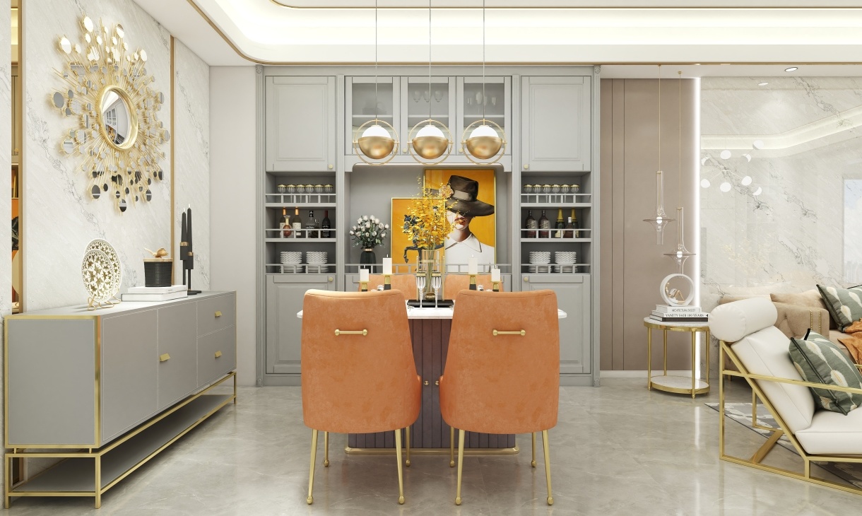 餐廳最重要的不只是餐椅,一個好的餐邊柜也是必不可少的,分格酒柜,封閉收納柜、玻璃柜門三種元素混合在一起的定制餐邊柜,即時尚又精致,搭配上質感十足的餐椅,輕奢之感肆意而出。