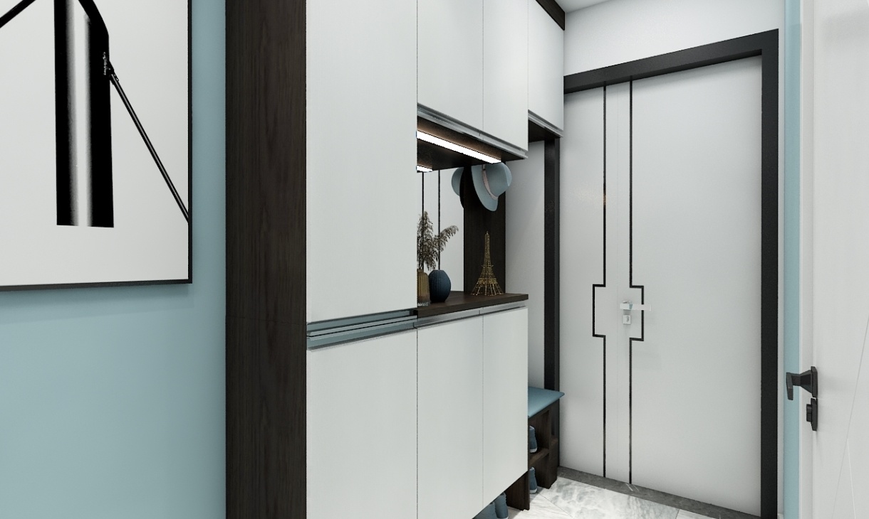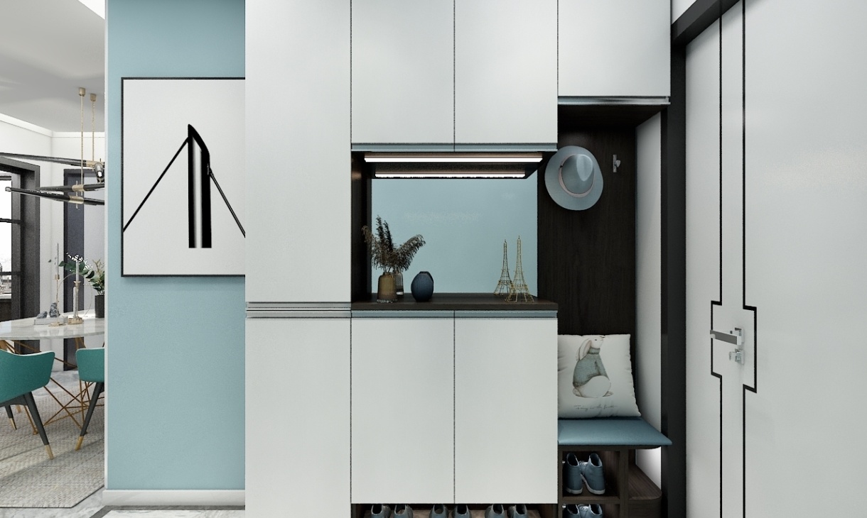 入戶顧名思義就是最先看到居家空間,米白色搭配淡藍(lán)色盡顯舒適,一開門就可以感受到家的溫馨。懸掛架方便存取外套,下面設(shè)計(jì)換鞋位方便實(shí)用。展示區(qū)設(shè)計(jì)了鏡子,出入可以整理外形,讓生活更精致。