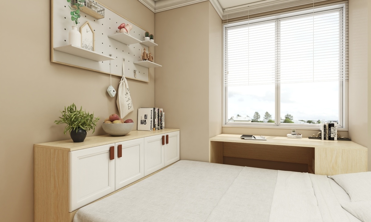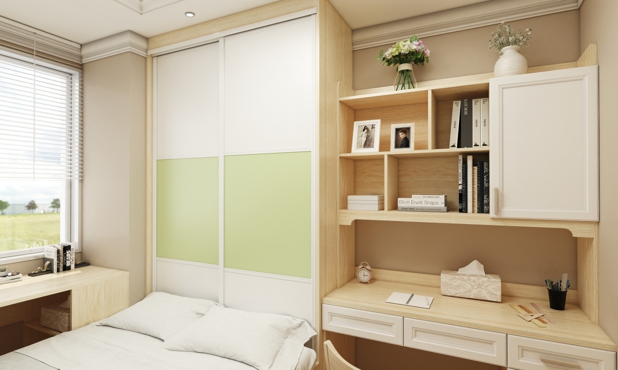 原木色的定制書桌柜,面積不大實用性很強(qiáng),開放格擺放相冊記錄美好童年,上面花瓶裝飾更顯精致用心。推拉衣柜代替裝飾床頭更實用,最大程度上利用空間,陽臺桌光線充足,是看書學(xué)習(xí)的風(fēng)水寶地。