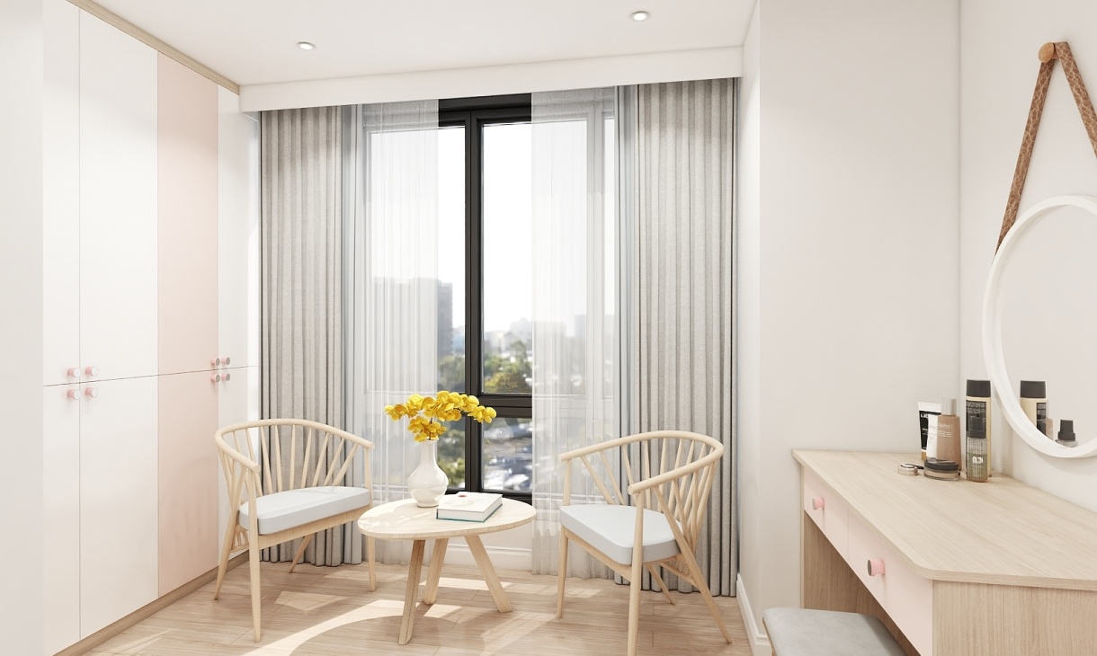 優(yōu)雅不顯幼稚的馬卡龍粉,使得空間充滿浪漫的氛圍,女孩心思細(xì)膩更適合這種清新淡雅的居住空間,簡潔是梳妝臺滿足日常需求,充滿設(shè)計感的床頭柜加入一個圓形小凳子,也可以當(dāng)做小茶幾使用。