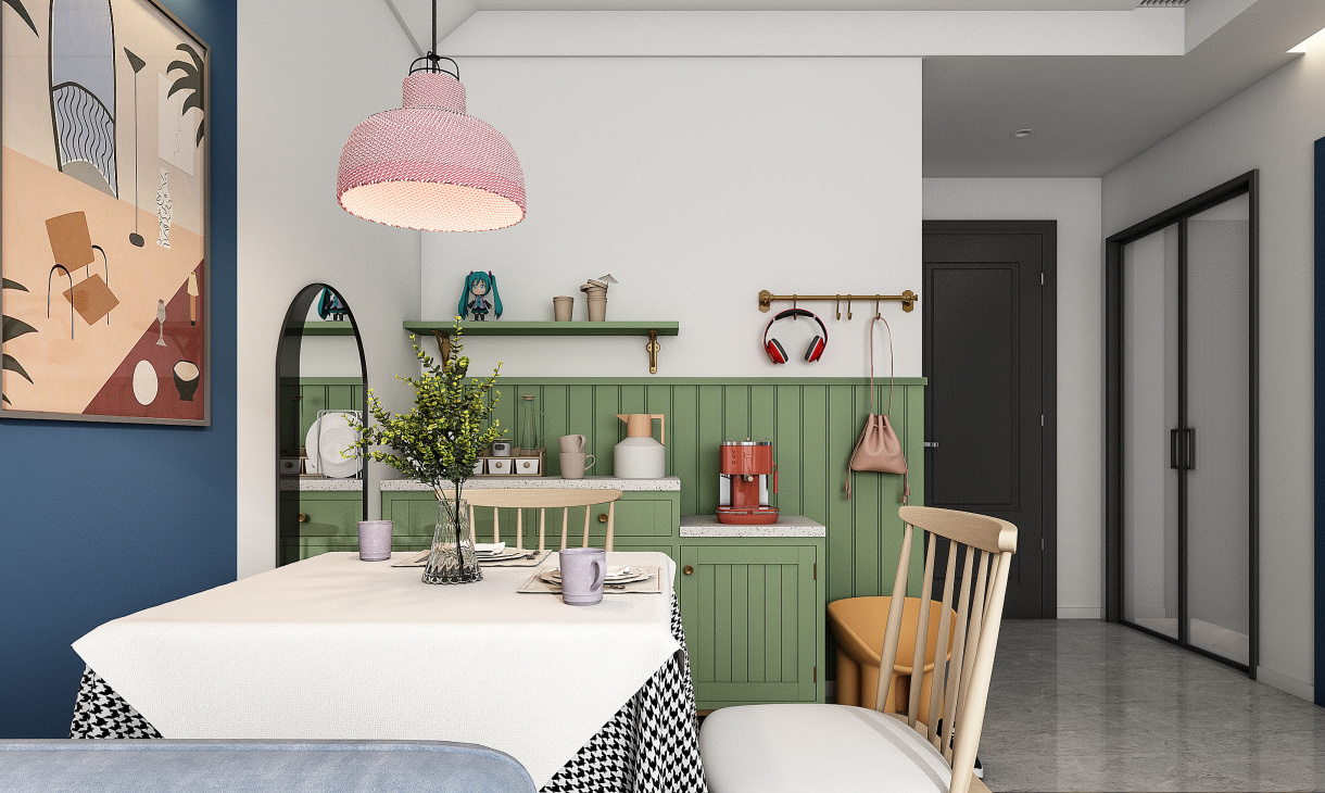 餐椅選擇木質材料,質感與實用并存,顏色搭配豐富不顯花哨,餐邊柜也可以當作入戶柜,設計懸掛處更節省空間。