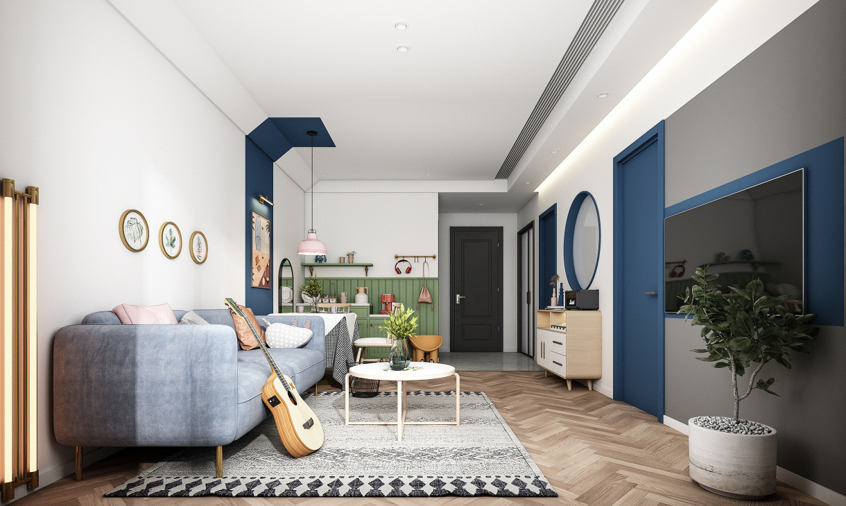 客廳與餐廳無縫銜接,兩個空間自然過渡,湛藍色的點綴更顯質感,開放式休閑陽臺彰顯生活情調。綠色餐邊柜更顯時尚,在用餐時仿佛身處戶外,綠意盎然的環境使得人身心舒暢。