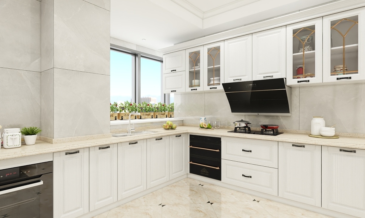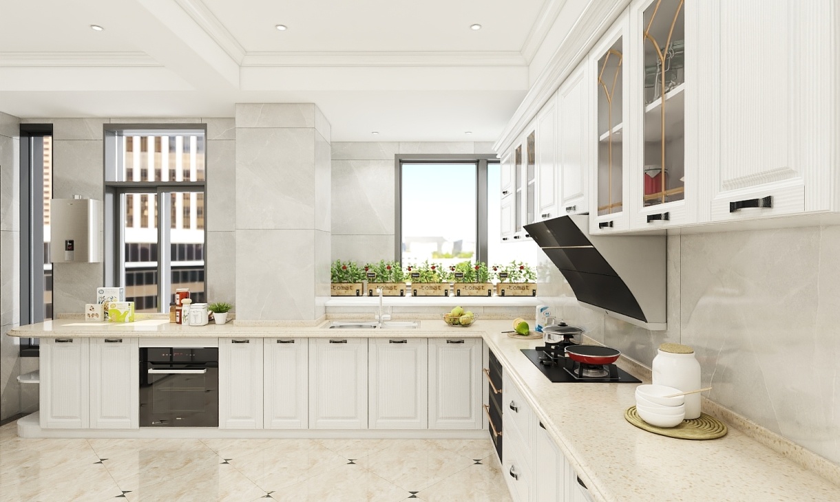 浪漫的歐式廚房,精致的讓人嘆服,一眼望去只覺著生活是一種享受,具有歐式經(jīng)典元素的定制家具,簡潔的拉手實用美觀,整體色調(diào)采用米白色為主,與花紋地磚區(qū)分開來,整潔更顯格調(diào)。