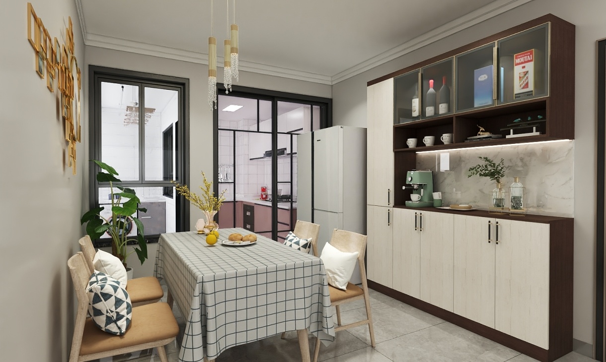餐桌與餐邊柜平行擺放,白色搭配褐色木質(zhì)餐邊柜加入時(shí)尚的玻璃材質(zhì),與客廳空間的電視柜相呼應(yīng),淺木色餐椅盡顯舒適,質(zhì)感十足的吊燈充滿現(xiàn)代設(shè)計(jì)感。