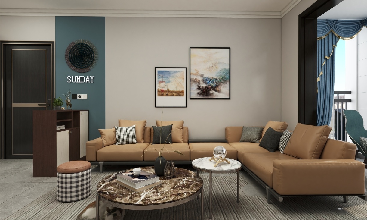 客廳的家具配色大膽,L型駝色沙發(fā)加以海藍(lán)色點(diǎn)綴,格調(diào)之中更添神秘,每一處都能表面業(yè)主的生活態(tài)度和品位。
