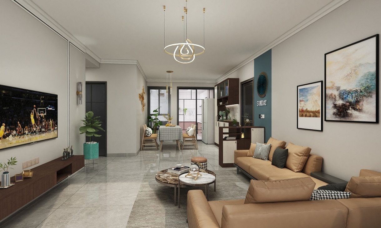 L型駝色皮質(zhì)沙發(fā)搭配圓形金屬邊框小茶幾,時(shí)尚有品位,簡潔的矮柜以及阻斷柜使得空間感十足,餐廳、廚房、客廳一目了然,生活不需要過于繁瑣,點(diǎn)綴的綠植像是空間一大亮點(diǎn),顏色明亮的花盆給空間增添了一絲濃烈色彩。