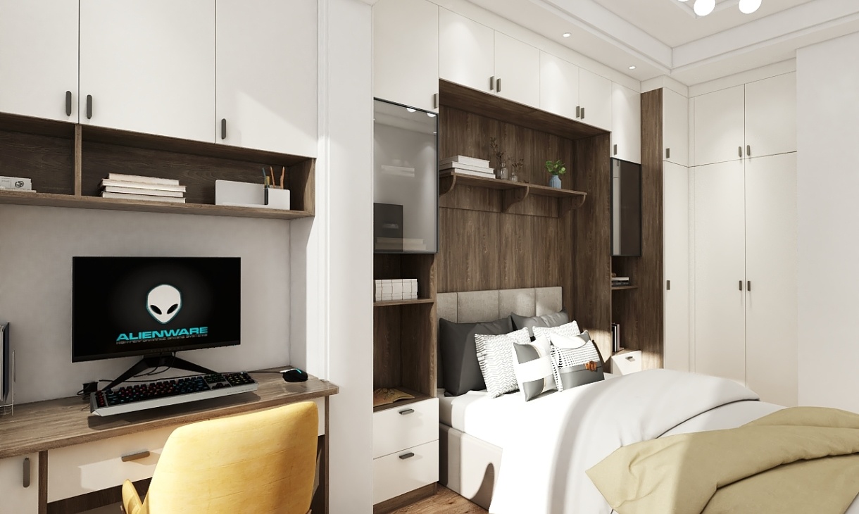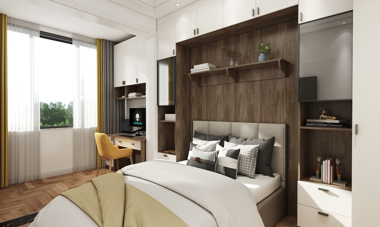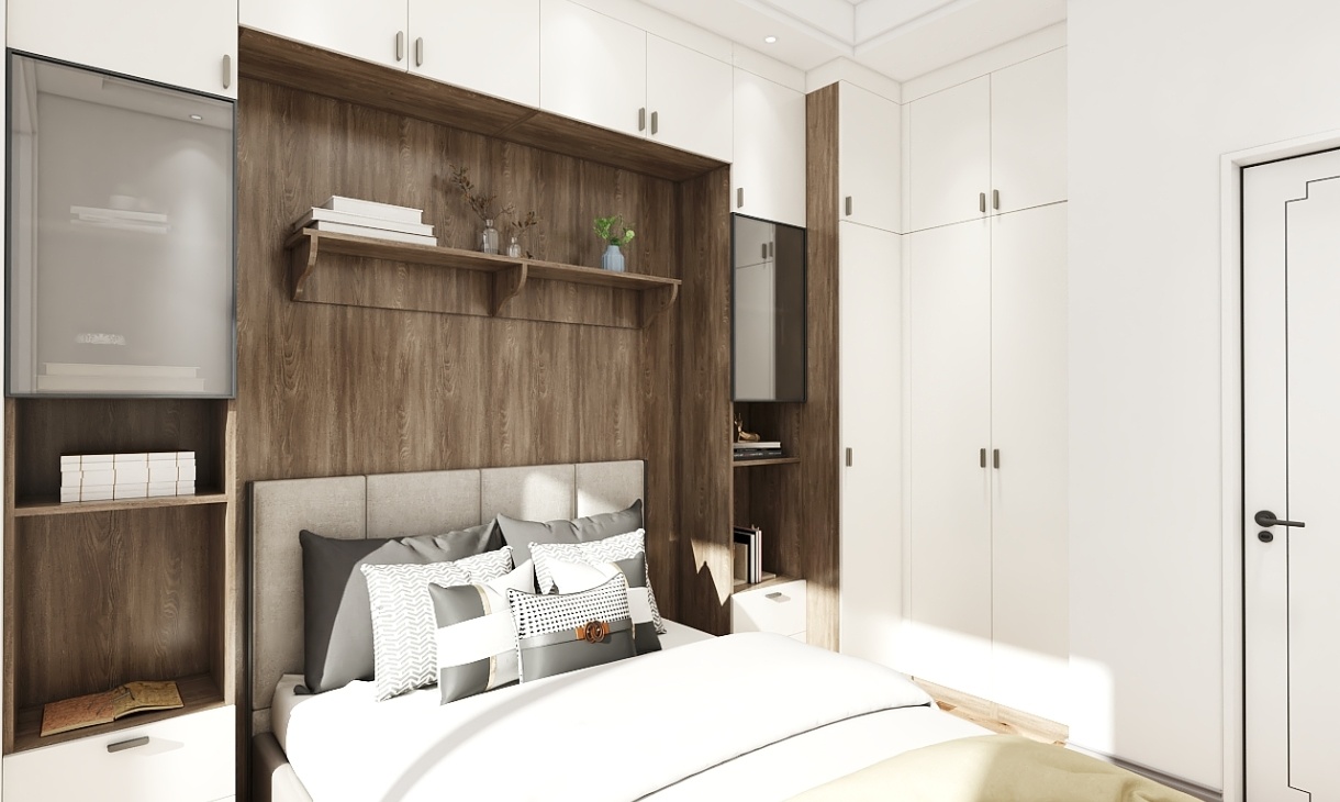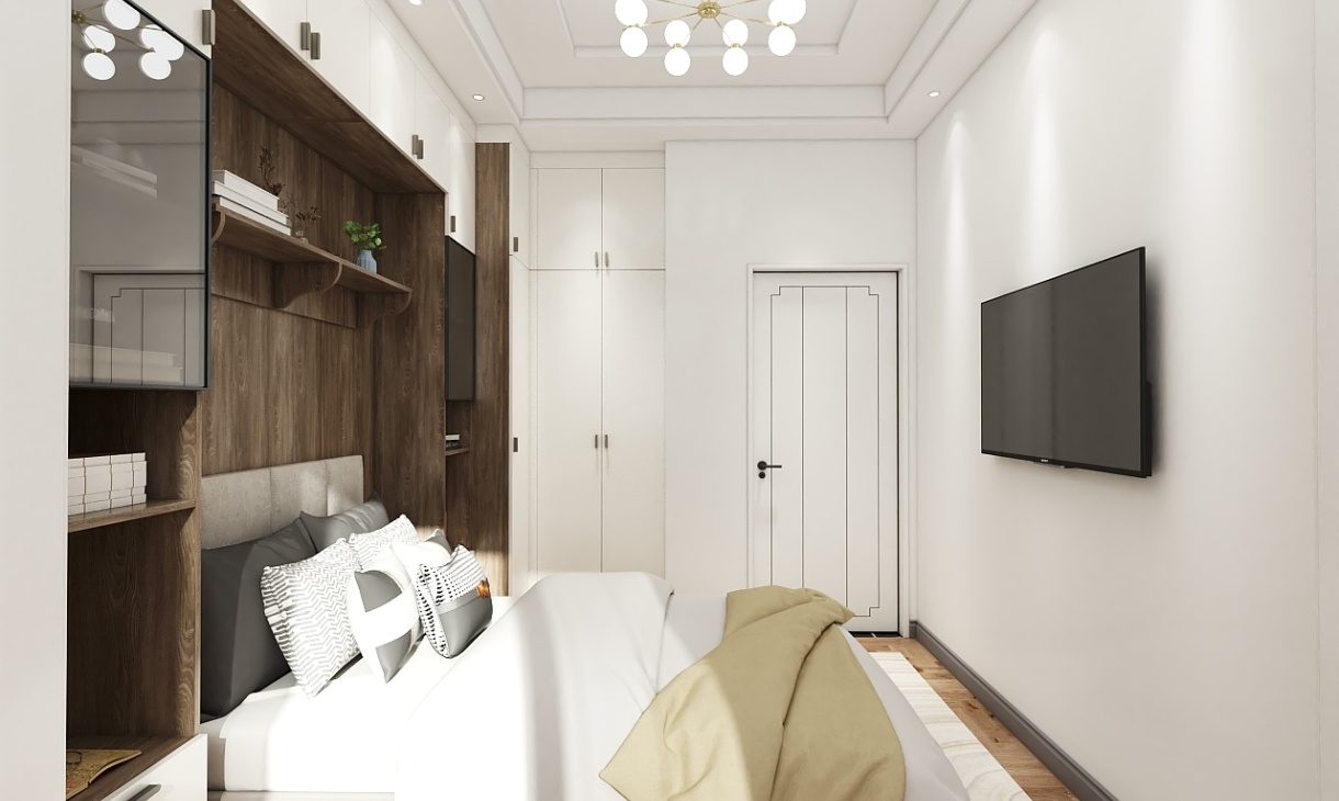 鑲嵌式吊柜,搭配纖薄柔軟的床頭,節省空間又美觀,既能裝飾又能收納兩不誤。