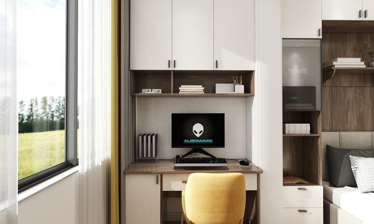 陽臺設計成學習空間,光線充足保護孩子的視力,最大程度上提升孩子的效率,素色的家具能潛意識地提升孩子的審美能力。