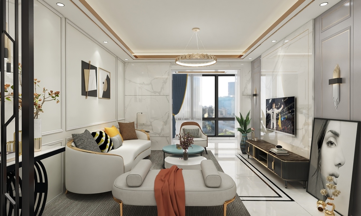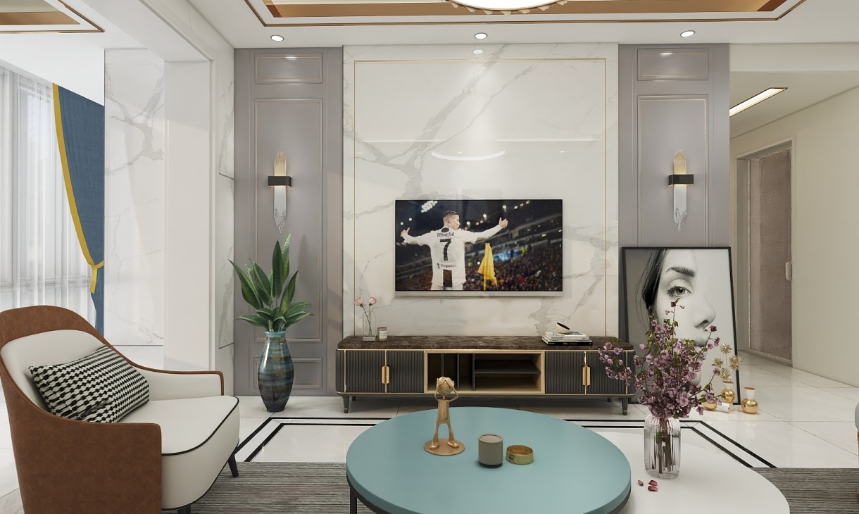 深色柜體搭配金屬色邊框的時尚矮柜,提升了整個空間的格調,兩邊的裝飾格外用心,設計者用細節來展現業主的生活品位。