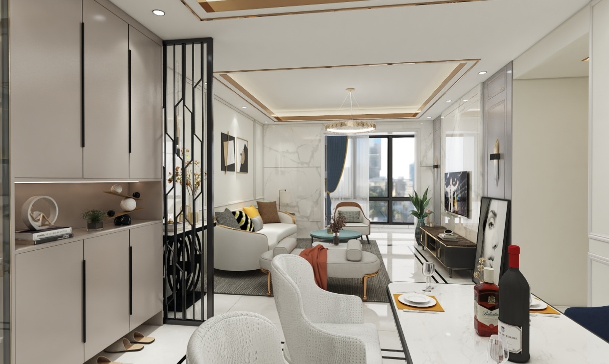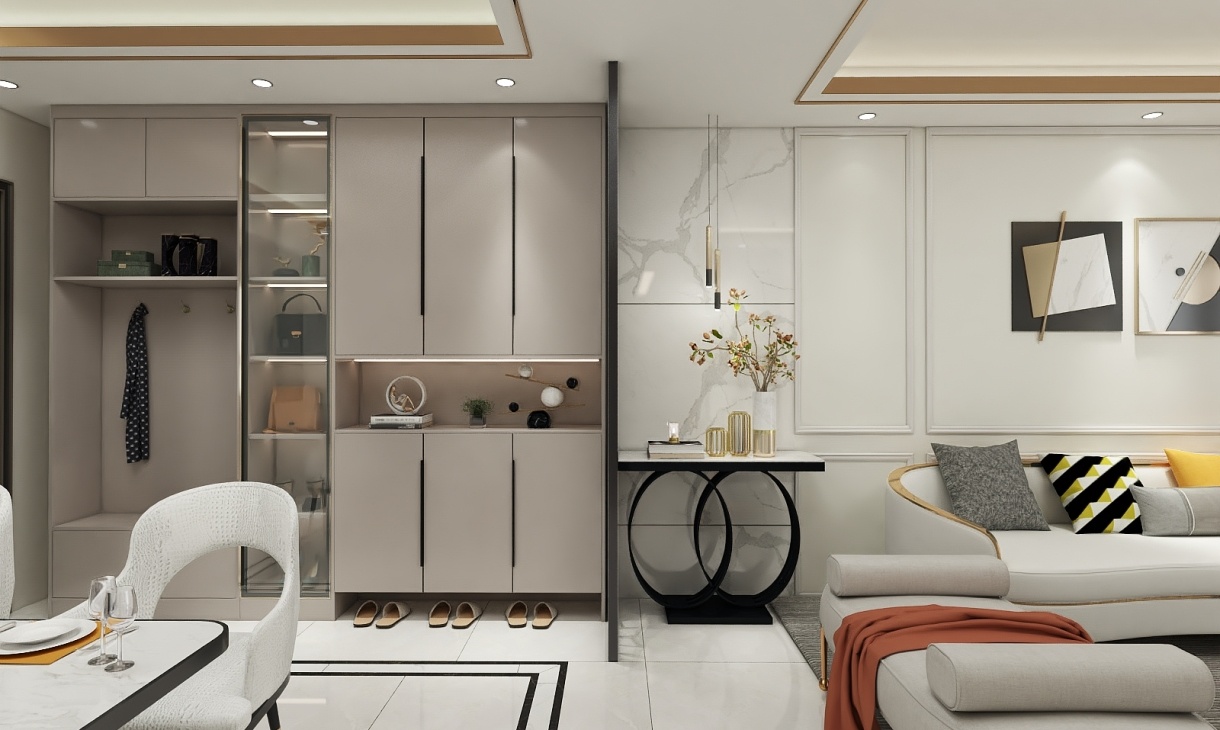餐廳與入戶于一體合理利用空間,精致的入戶柜裝飾著餐廳空間,還完美的客廳空間,使得三個空間相輔相成。