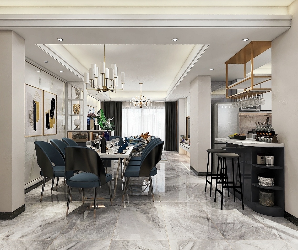 開放式廚房的吧臺與餐廳相連,時尚又美觀,吧臺設計簡易吊柜,用來儲藏美酒。大理石餐桌搭配質感座椅,格調十足。