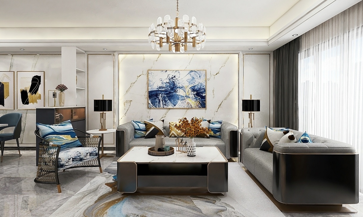 客廳是最能彰顯品位的空間之一,灰色質感沙發(fā)提升空間格調,充滿設計感的裝飾畫與抱枕相呼應,細節(jié)之處彰顯輕奢品味。