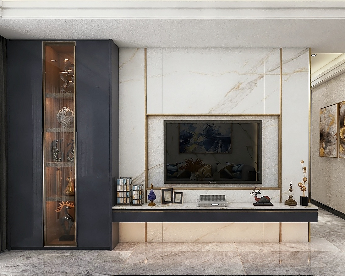 電視背景墻簡潔又大氣,鑲嵌式電視格外美觀,時尚裝飾滿足基本物件擺放與裝飾,客廳打通陽臺設計裝飾柜,盡顯生活品位。