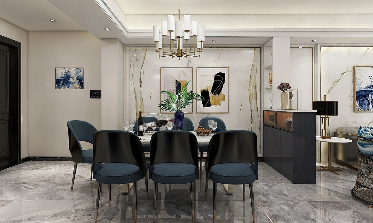精致小巧的餐邊柜,將餐廳與客廳空間隔離開來,滿足客廳的基本收納,充滿設計感的吊燈與裝飾化提升空間格調。