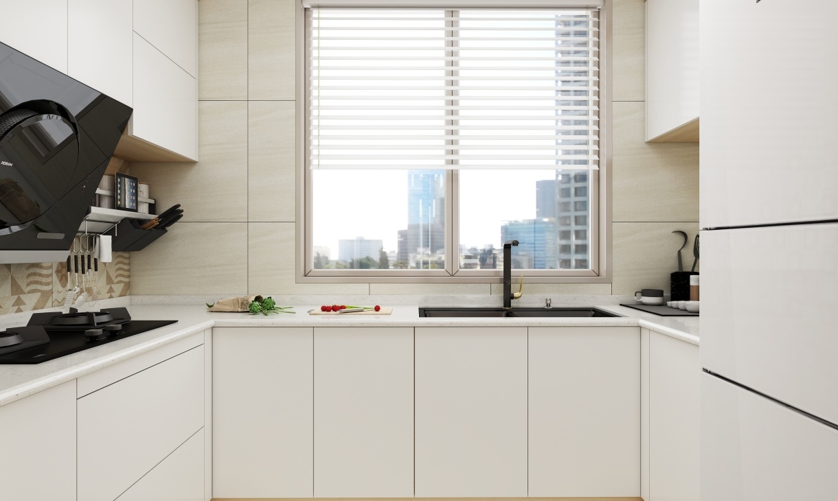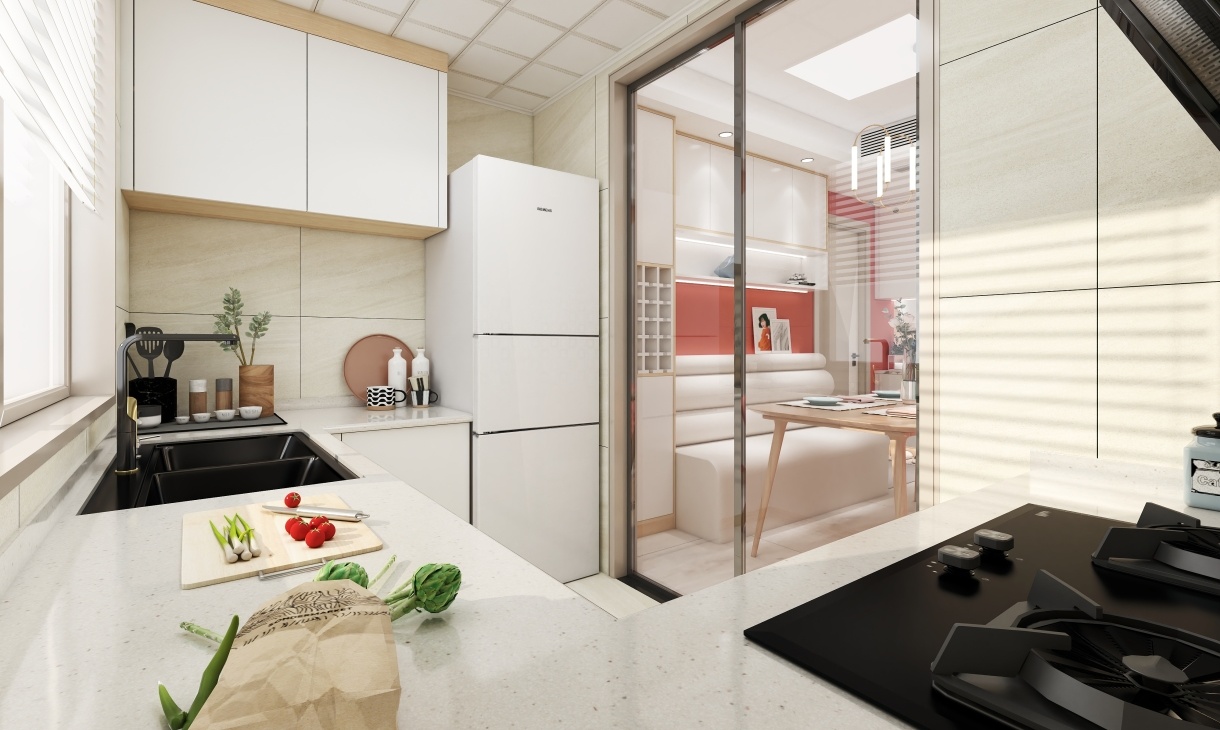 空間小首選U字型櫥柜,動線合理節省空間,整體櫥柜使得空間整潔實用,轉角處放置冰箱巧妙利用每一寸空間。