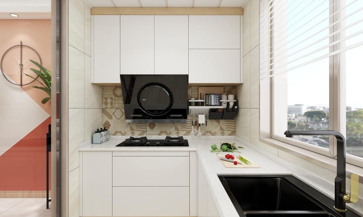 小廚房設計到頂櫥柜,整潔大氣,搭配原木色封邊盡顯舒適,按壓式柜門使用更方便。