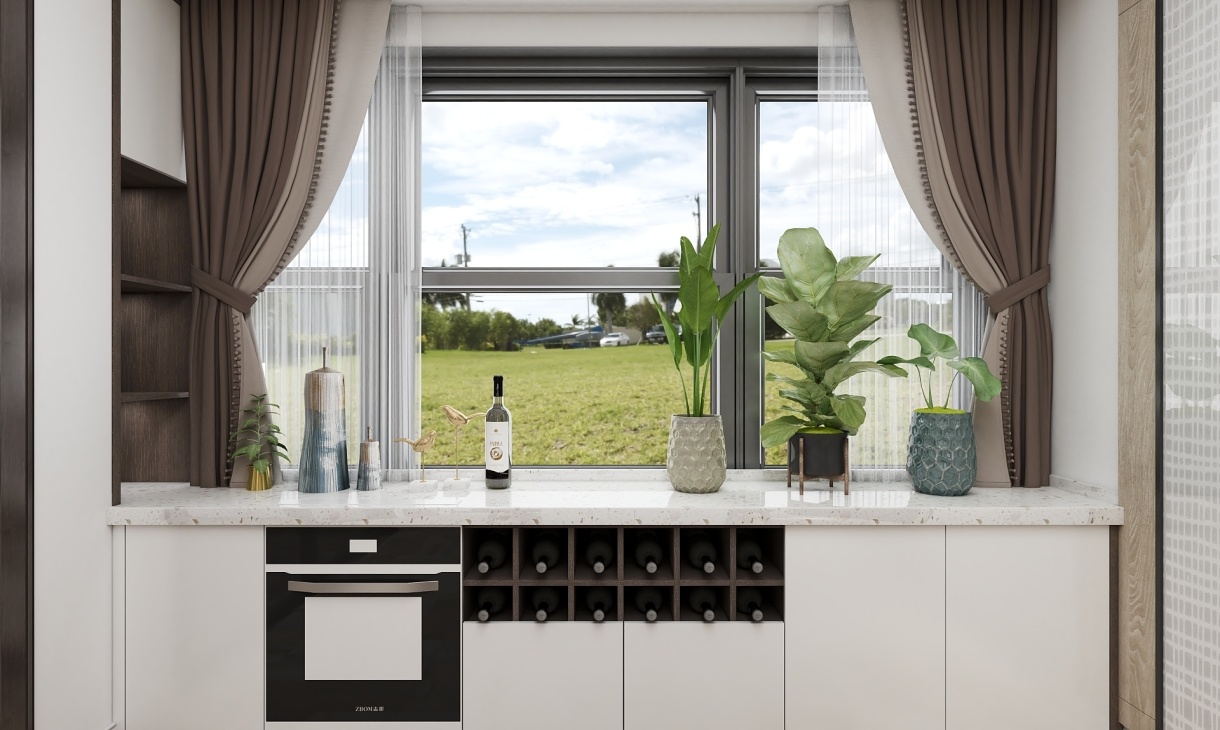 靠近窗戶設(shè)計(jì)餐邊柜,巧妙利用空間,鑲嵌式烤箱使用更安全,石英石臺面耐磨更實(shí)用,上面裝飾,下面收納兩不誤。