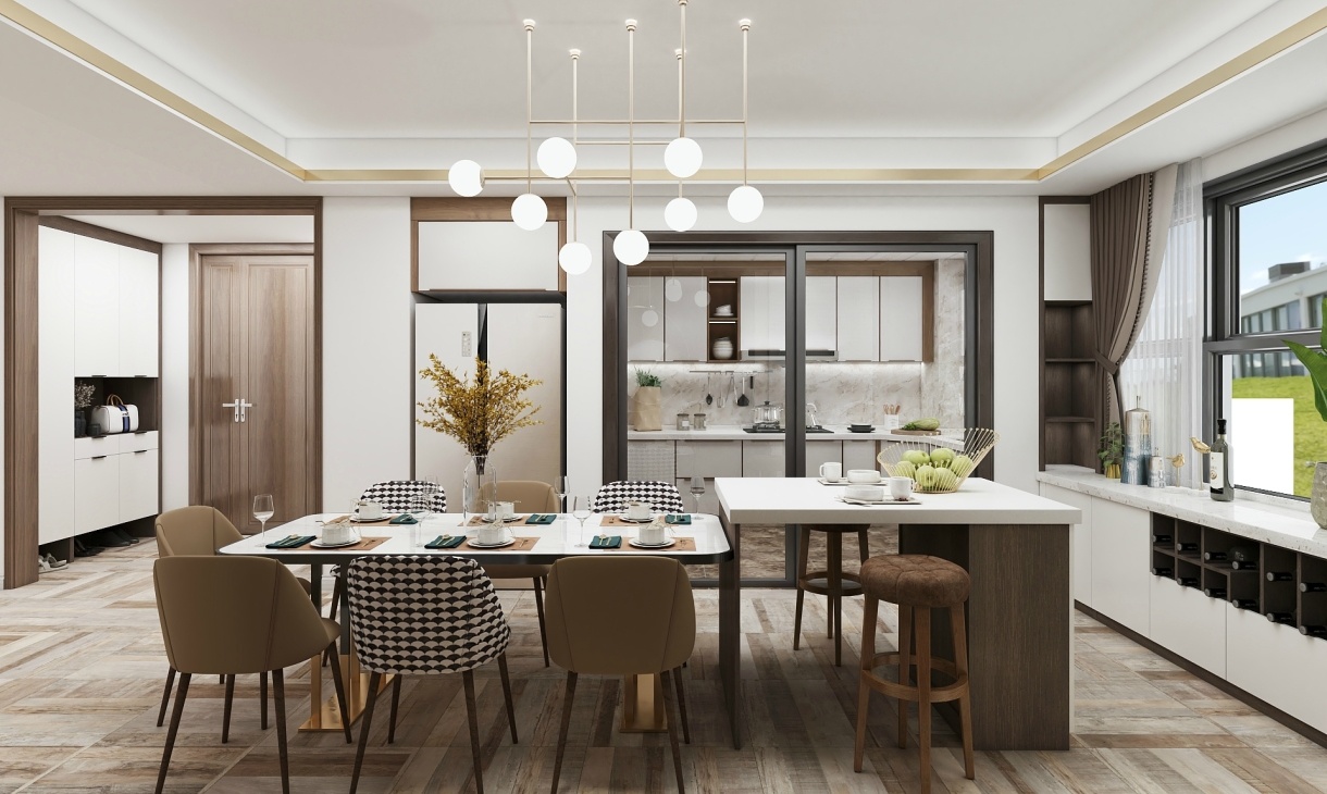 餐廳空間設(shè)計(jì)島臺,方便于與家人一起喝個(gè)下午茶加深感情,靠近窗戶定制餐邊柜,實(shí)用又簡潔。