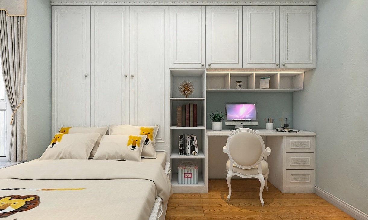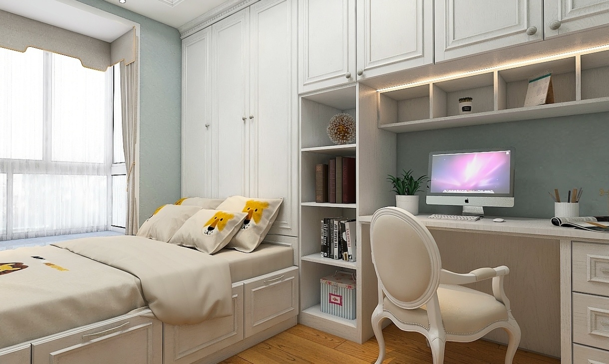 榻榻米的設計并不復雜、多余,巧妙利用每一寸空間,去掉無用的床頭,設計到頂衣柜與書桌組合,開放格的設計使用又美觀,榻榻米房也可作為兒童房使用。