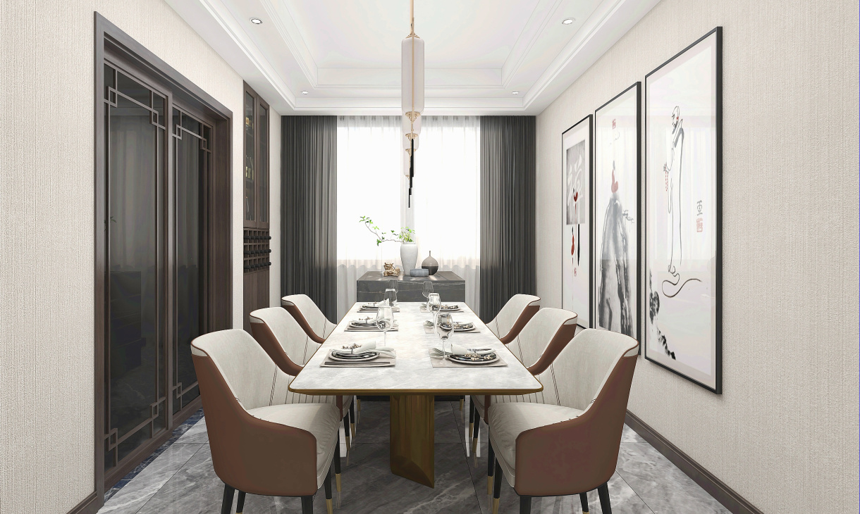 餐廳中式風格略微摻雜輕奢,色調清淺,給人一種視覺舒適感。