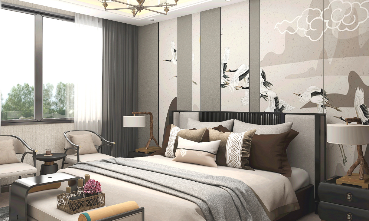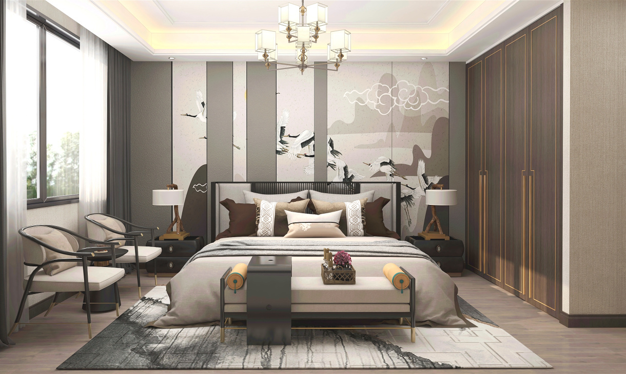 臥室設計整體沿襲新中式的風格,精致細膩的金屬、柔軟的布藝和皮革相結合,在光影的作用下,勾勒出高貴典雅的的生活藍圖。