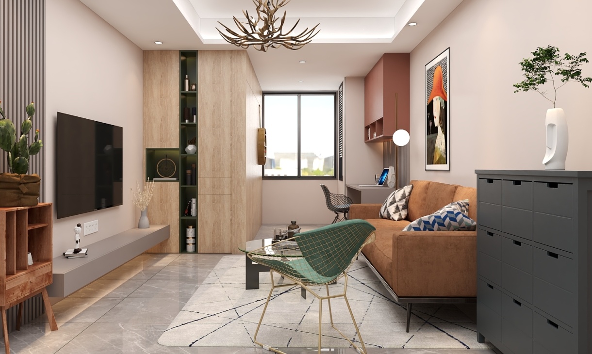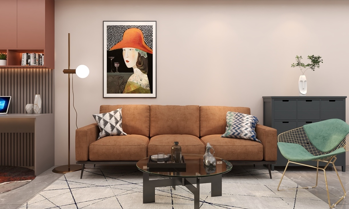客廳設計成現代簡約風,兼顧實用性的同時又保證美感,棕色的一字型沙發搭配精致單椅更顯時尚。