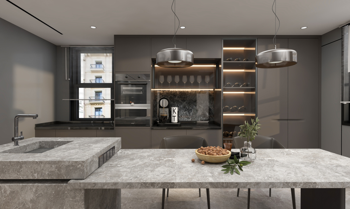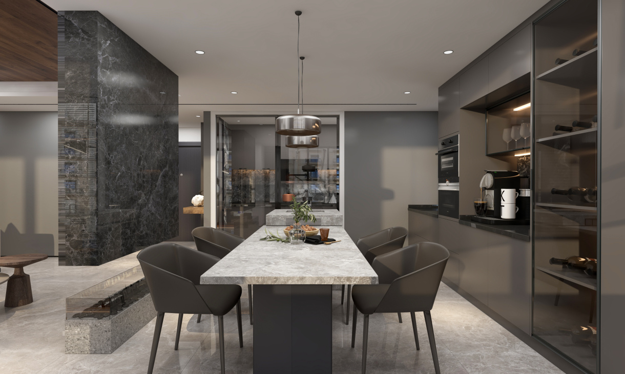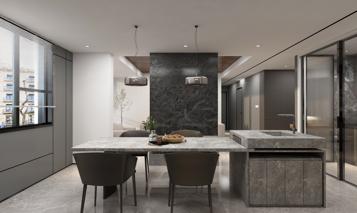 大理石的裝飾代表著對于高品質的追求,高級灰的色調營造出雅致的餐廳空間。
