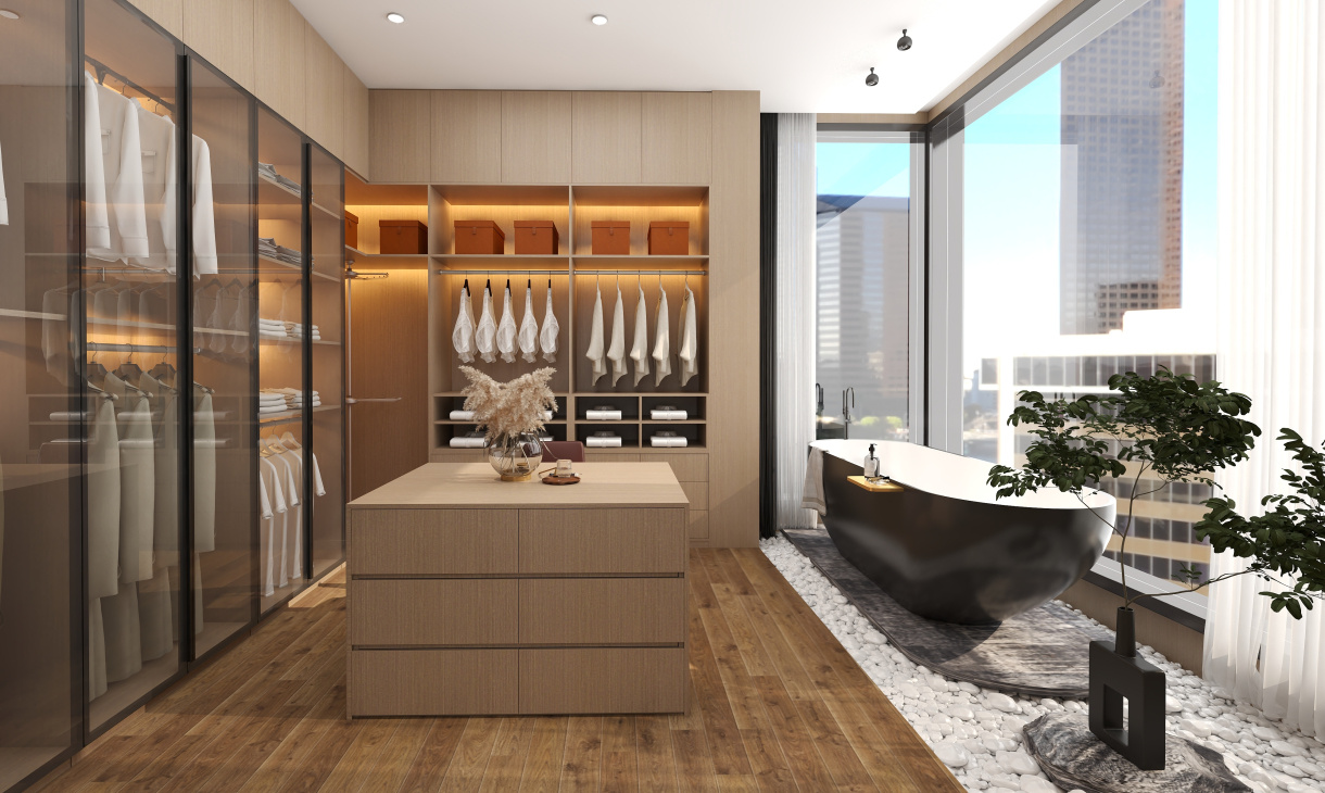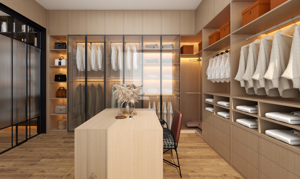 開放式衣帽間是快節奏生活的居家生活必需品,一個完美的衣帽間,讓忙碌一天的屋主回到家就可以感受到沉靜舒適感。