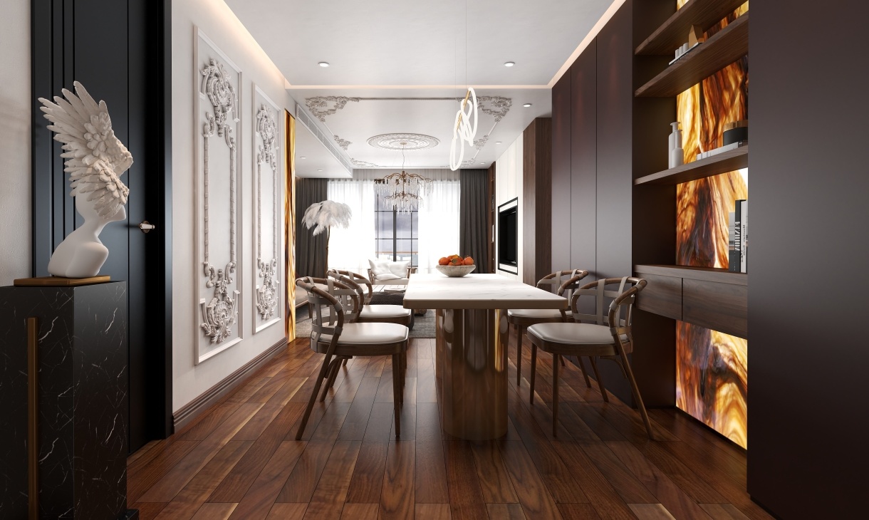 餐廳的深淺搭配色調(diào)明顯,深色餐邊柜給人一種大氣磅礴之勢,淺色的餐桌椅高冷獨(dú)。黃色火焰為餐廳增加一些暖調(diào),展現(xiàn)熱情似火的空間氛圍。
