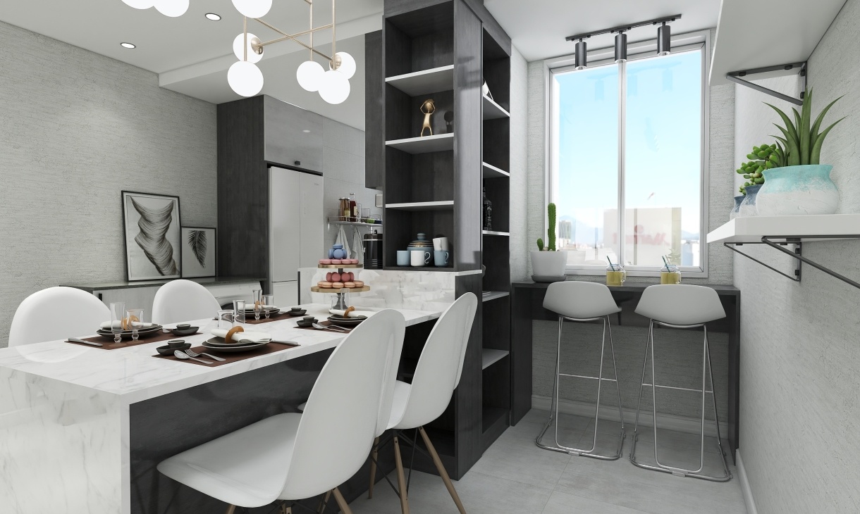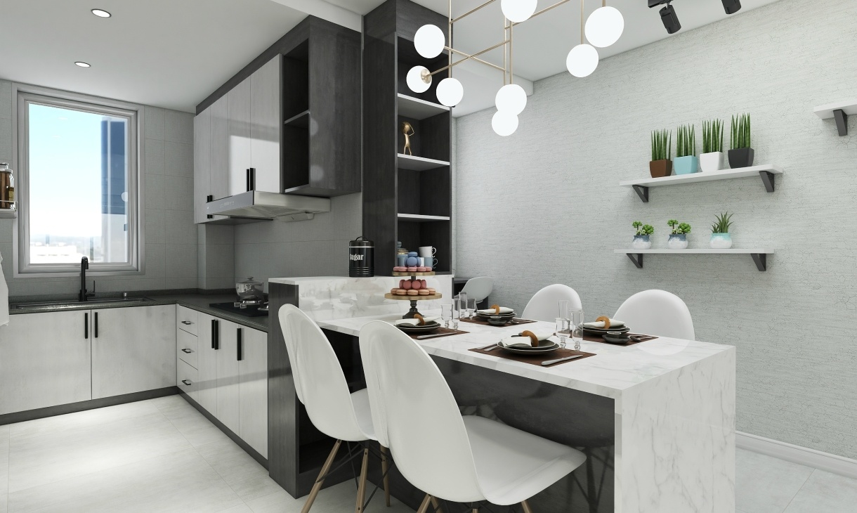 餐廳定制大理石吧餐桌與開放式廚房銜接,空間整體性統一,品味凸顯,整屋高級灰色調壁布質感柔和,金屬色吊燈點綴盡顯奢華。