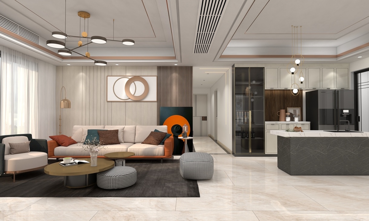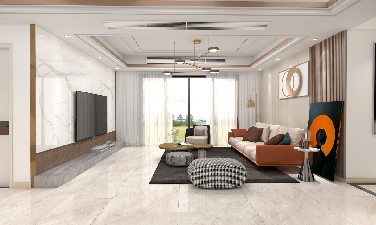 客廳的電視背景墻采用天然大理石搭配木材打造出一個極具輕奢又不失簡約的電視背景墻,米色與橙色組合的沙發、深灰色的地毯,簡單利落地營造出層次感。