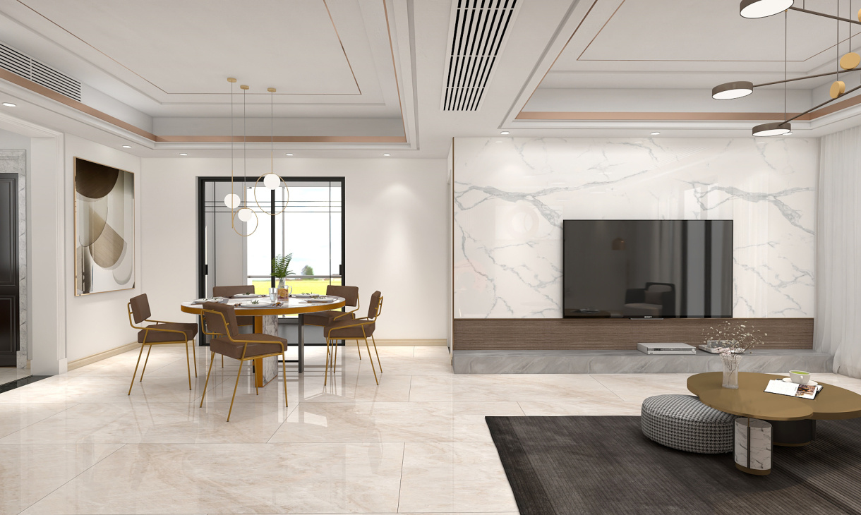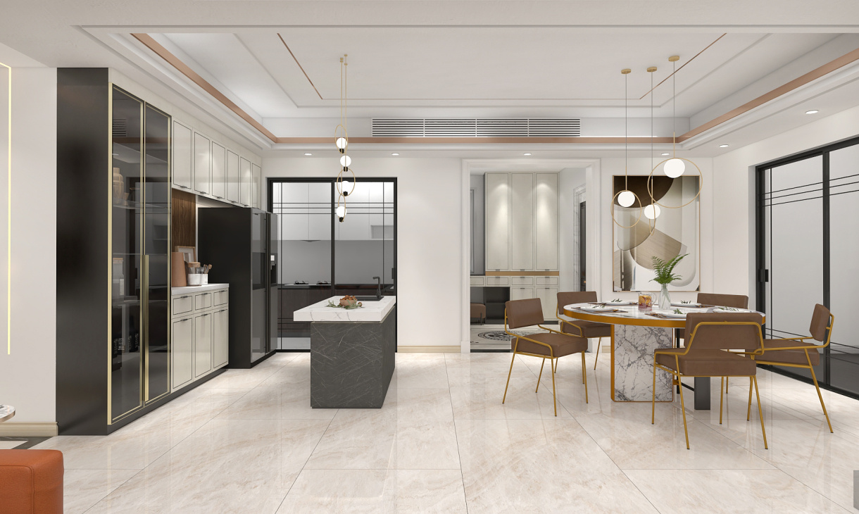 客餐廳相連,延續整體風格,通過地磚鋪設形成一個簡單統一的空間,明確功能。墻面設計裝飾畫便于展示提高空間格調。